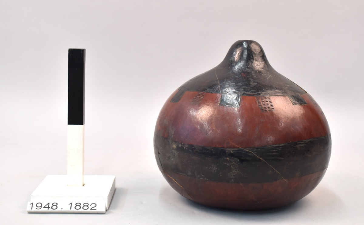 Dafa. Calabash container decorated with incised lines and coloured black and red. Taken, filled with meal, by a bride to her wedding. Broken and repaired with infill.