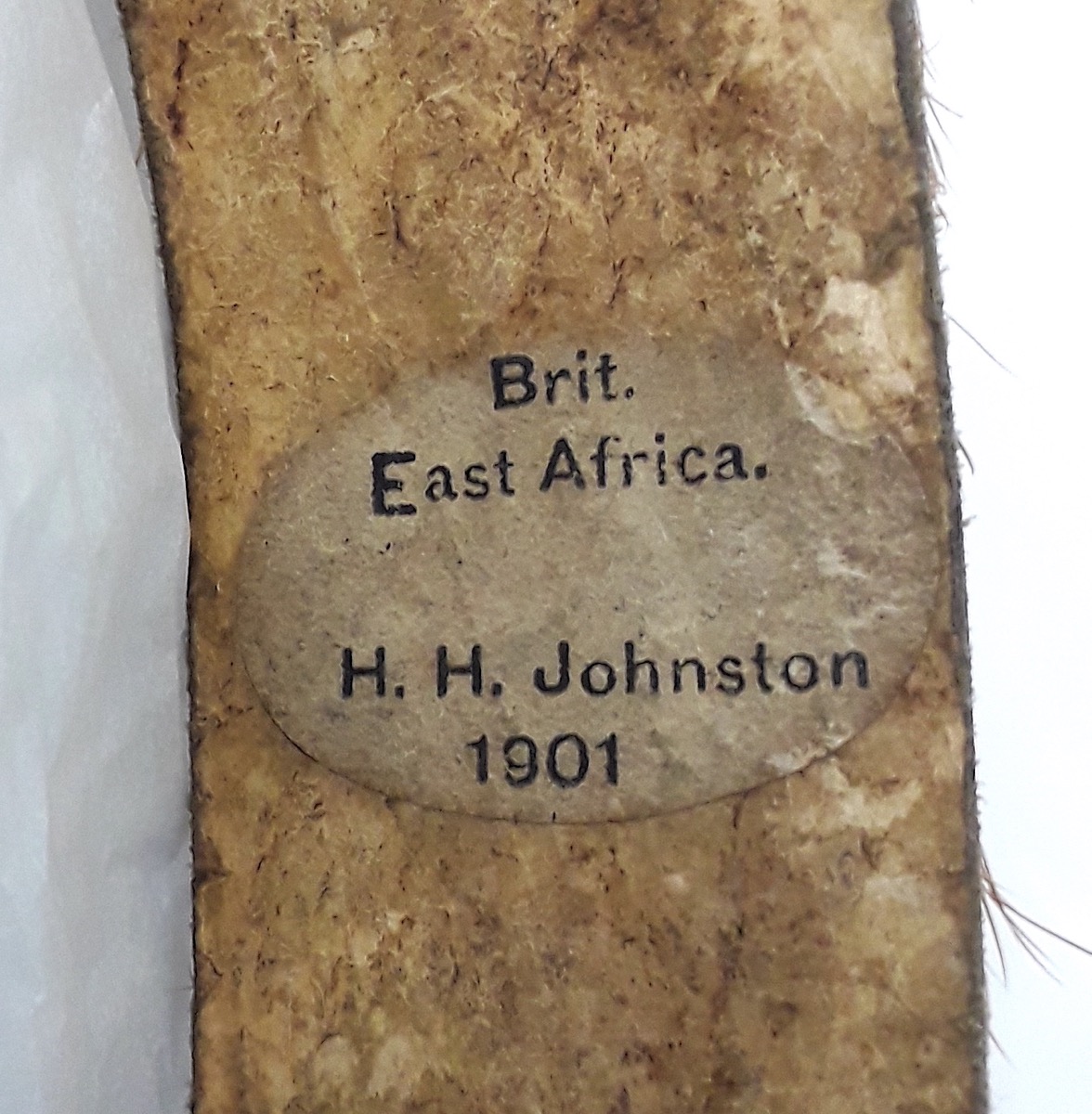Old printed oval exhibition label on inside of hide strap notes 'Brit East Africa H.H. Johnston 1901".