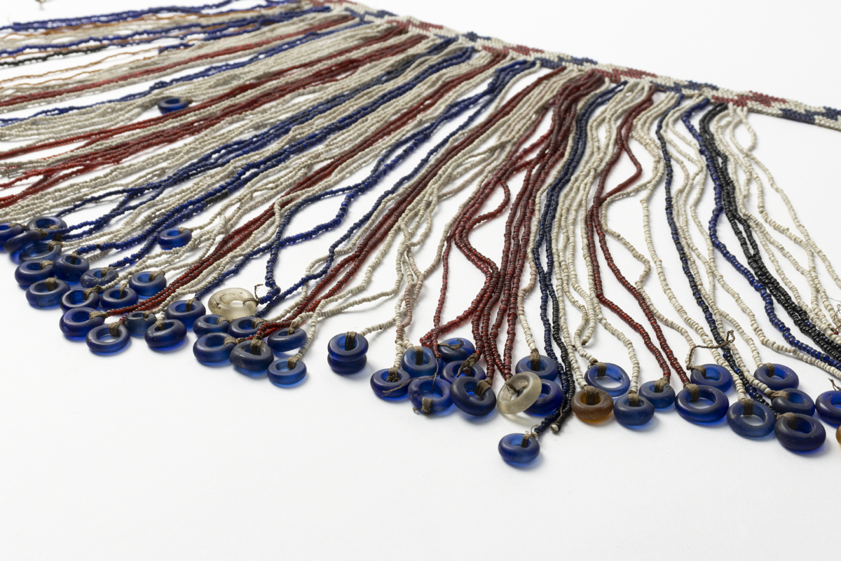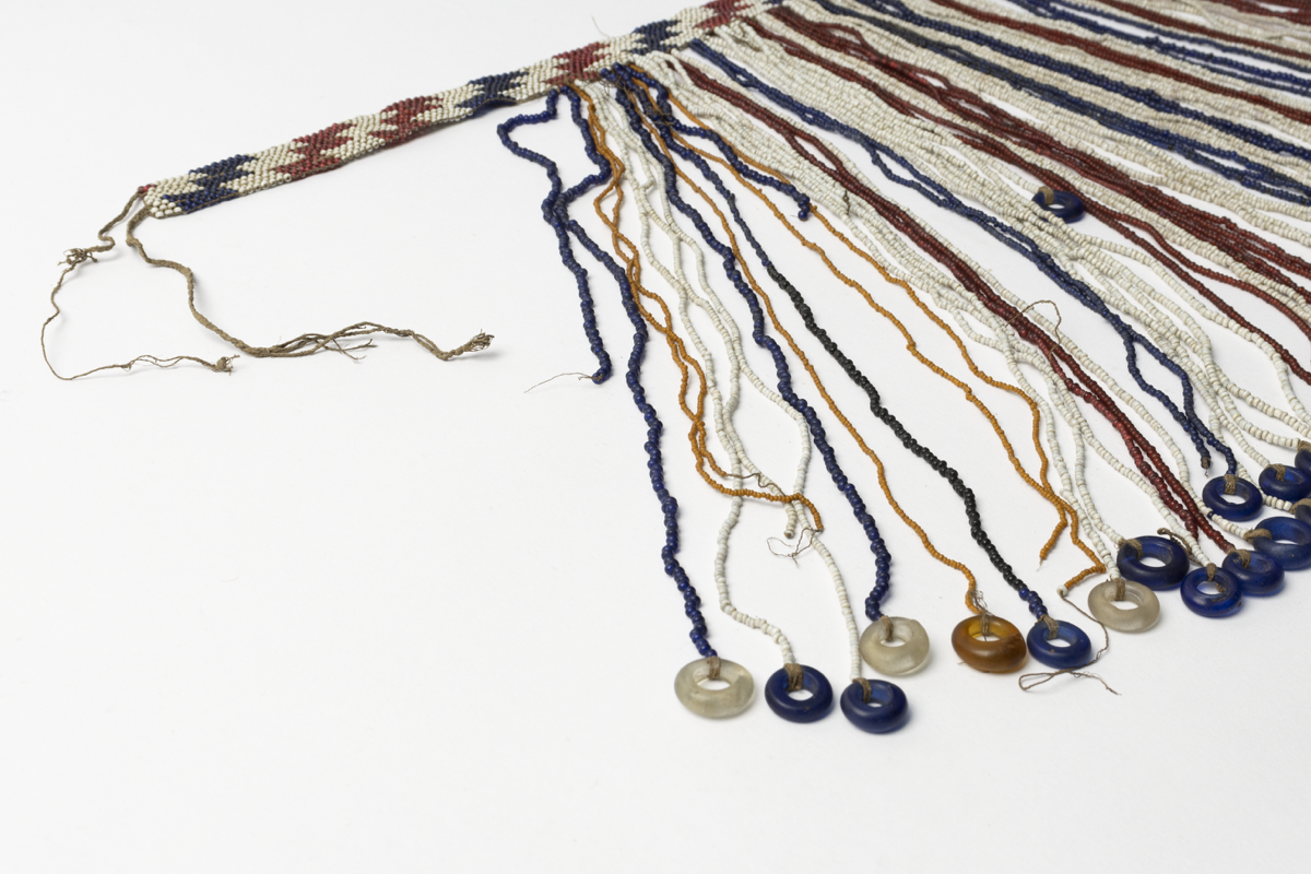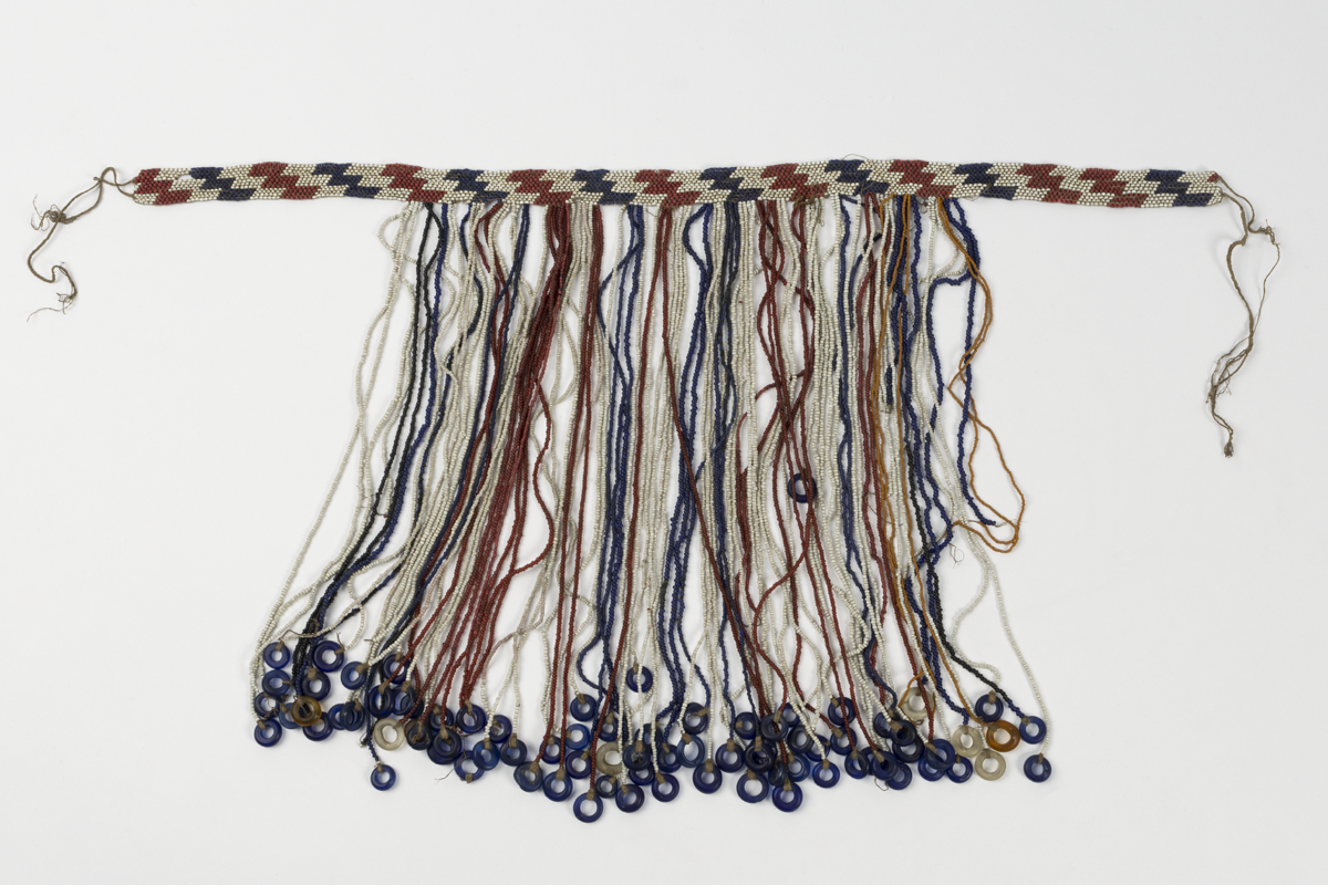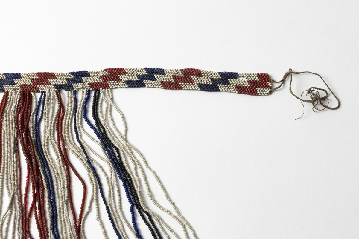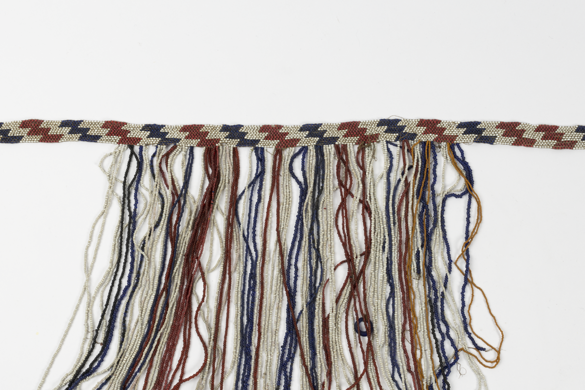 Headband of glass beads. Headband is made of a circlet of blue, white and red beads in a zigzag pattern. Strings of red, blue, white, black and yellow beads hand down from the circlet, most ending with a blue, clear or yellow annular bead. Most of the annular beads are dark blue.