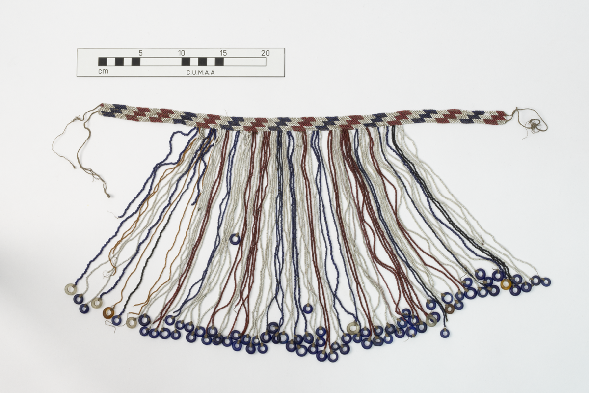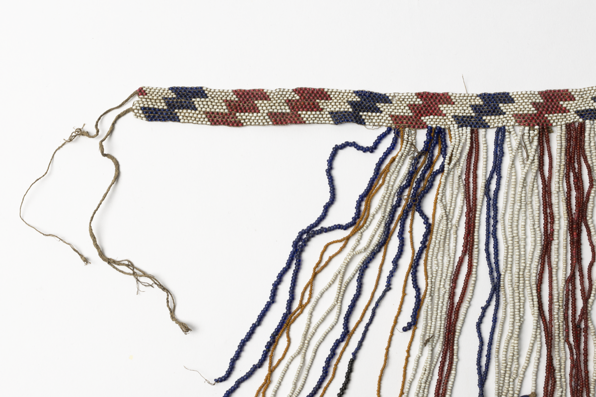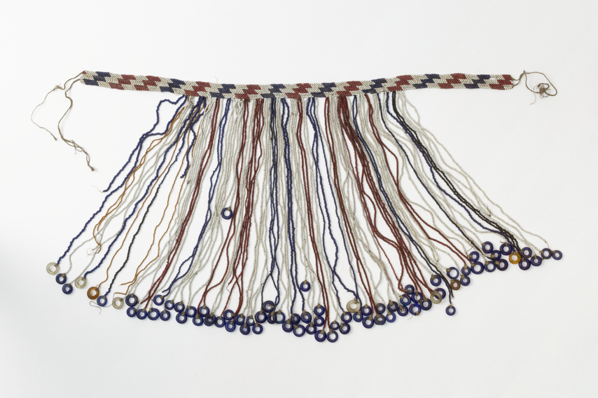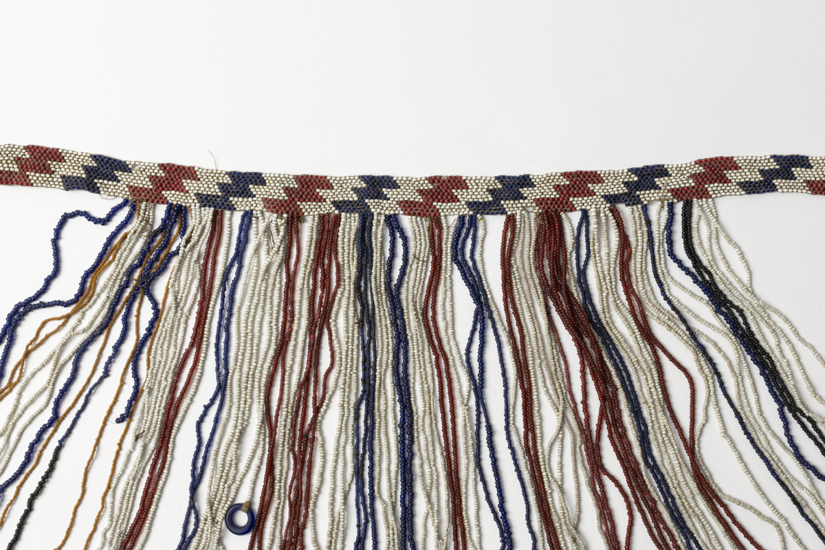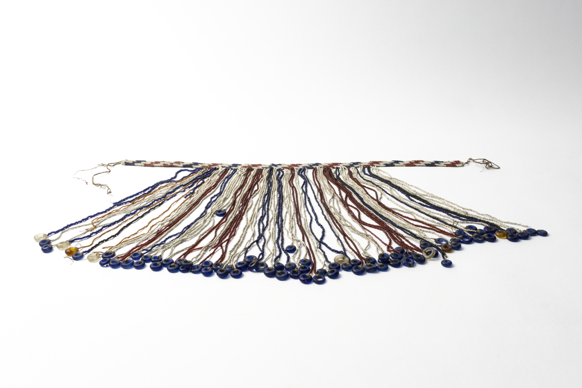 Headband of glass beads. Headband is made of a circlet of blue, white and red beads in a zigzag pattern. Strings of red, blue, white, black and yellow beads hand down from the circlet, most ending with a blue, clear or yellow annular bead. Most of the annular beads are dark blue.