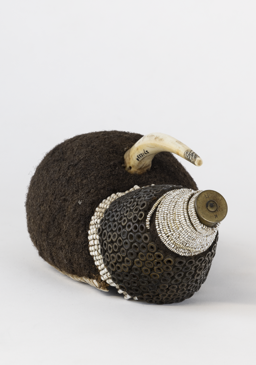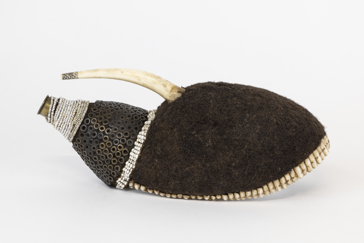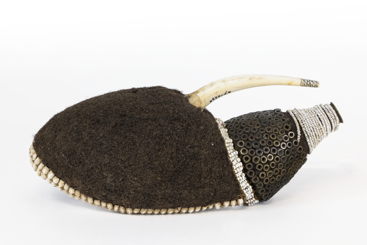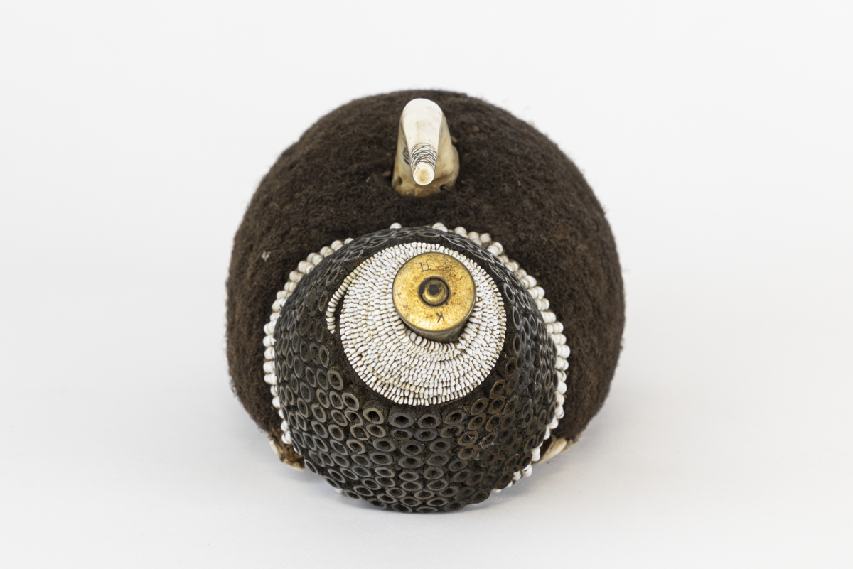 Head-pad, decorated with cone and ivory projection. A hollow cap of felted human hair encircled by small pieces of cowrie shell threaded onto a single string. At the front is a curving ivory projection and cone with a foundation of human hair; the base is covered in four rows of annular white beads. The middle section of the cone is covered in brass and copper metal rings. The narrow end terminates in a brass bullet cartridge casing, marked with a 'K' and '∏', that is surrounded by strings of tiny white beads. Worn as an alternative to 1927.1523 B for those with shaved heads.