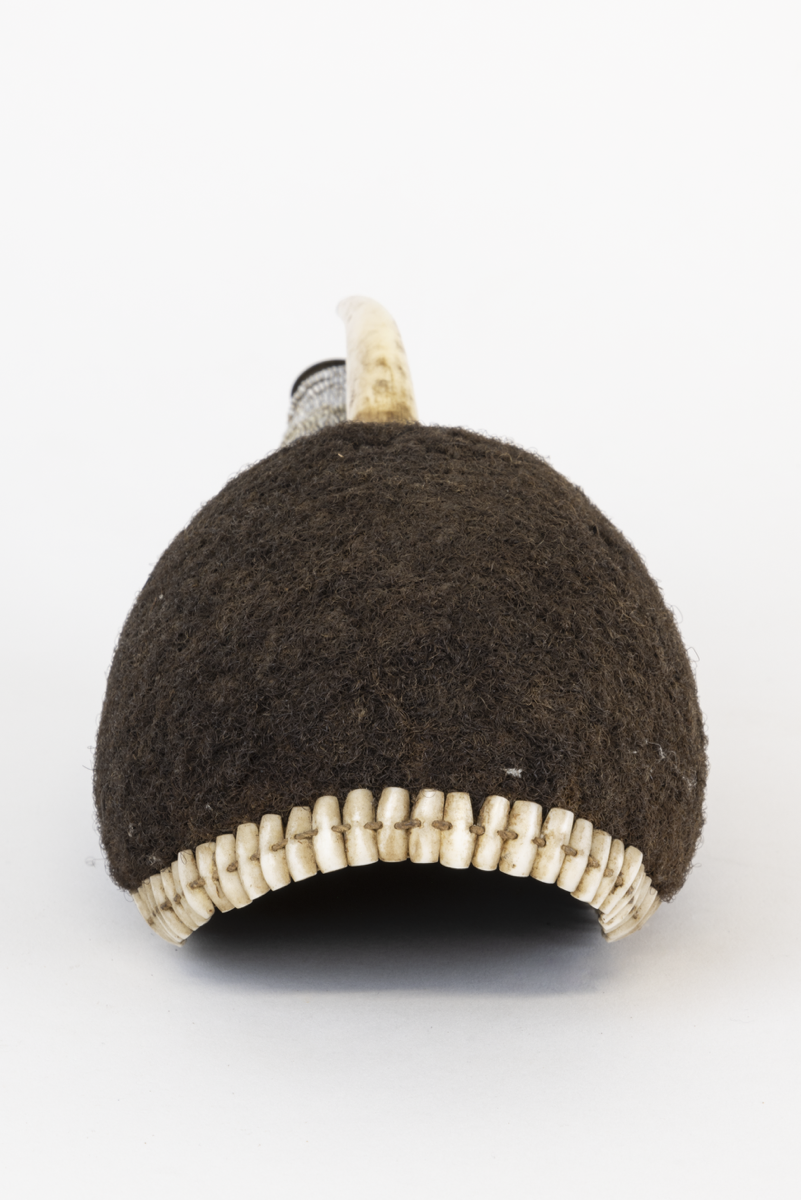 Head-pad, decorated with cone and boar's tusk. A hollow cap of felted human hair encircled by small pieces of tooth or bone threaded onto a single string. At the front is a boar's tusk and cone with a foundation of human hair; the base is covered in four rows of annular white beads. The middle section of the cone is covered in metal rings. The narrow end terminates in a cylinder of metal marked with a 'K' and '∏', that is surrounded by strings of tiny white beads. Worn as an alternative to 1927.1523 B for those with shaved heads.