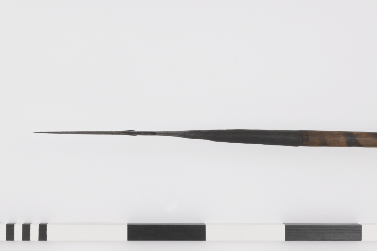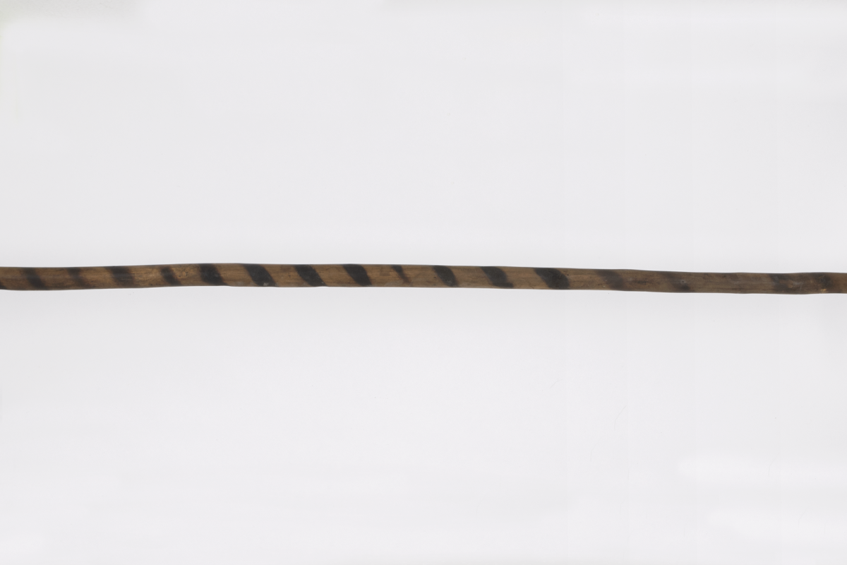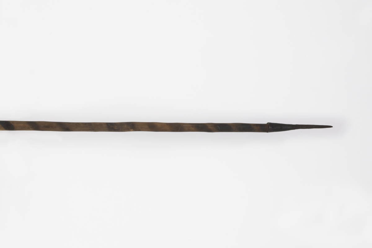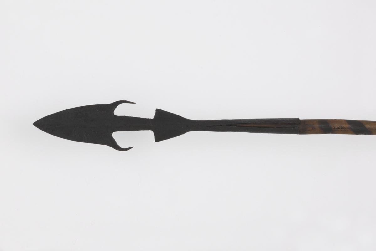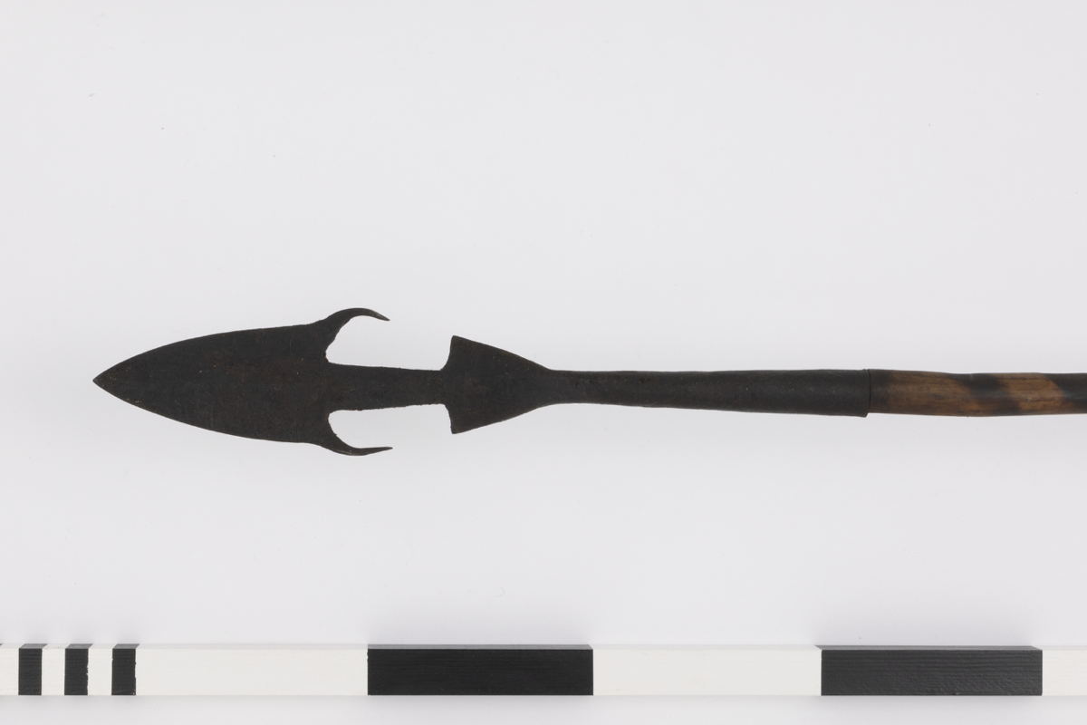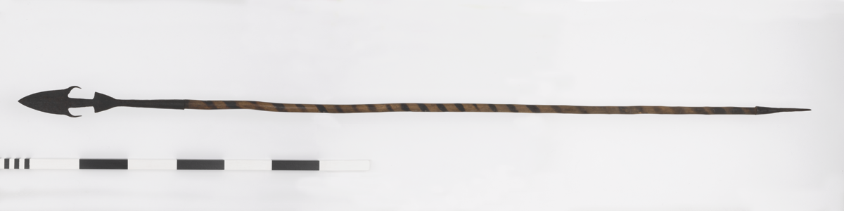 Spear. Triangular iron spearhead with trailing barbs and flat shank connecting the head to the socket. Wooden shaft decorated with darkly pigmented spiralling ornament. Tapering iron ferrule.