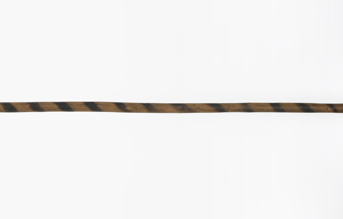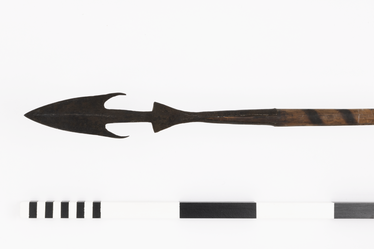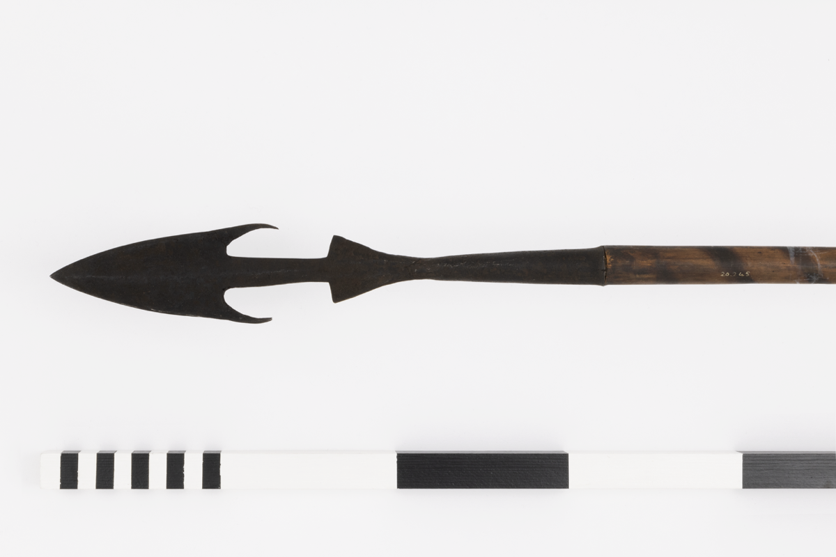 Spear taken in war and dedicated to Lubare. Socketed iron head with barbs, and two projecting wings. Smooth wooden shaft decorated with spiral band of dark colour and shod with socketed iron spike.