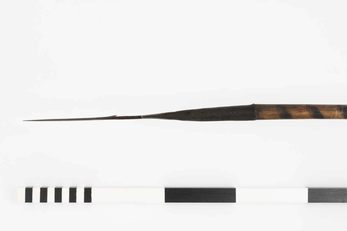 Spear taken in war and dedicated to Lubare. Triangular blade with slightly convex edges and two barbs, and a triangular wing on either side of the socket. Wooden shaft decorated with spiral band of dark colour, with a pointed iron ferrule at the end.