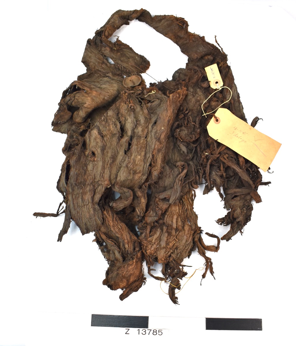 Jacket in vegetable fibre (?bark) with a button (? half of a nut shell) on the top.