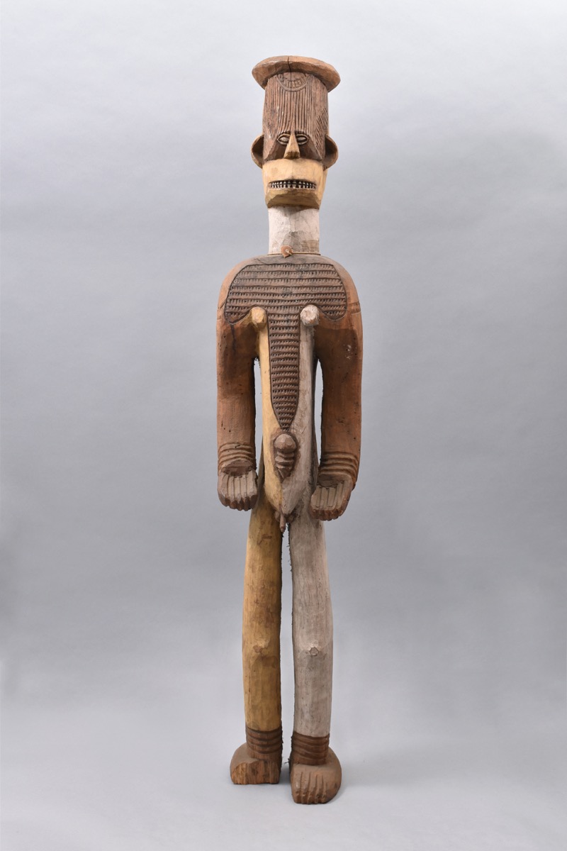 Tall wooden carving of a human figure with small ?breasts and penis, arms by sides and a large protruding navel. Scarification marks are carved into the face, chest, upper arms and belly, the ankles and wrists are carved to give the impression of bangles and there is a deep groove carved along the length of the back and between small buttocks. The figure is painted in yellow, brown and white, with one leg and side of torso painted white and the other yellow. The right foot is broken off at the front of the leg and the piece is stored with the figure. There are signs of historical pest damage.