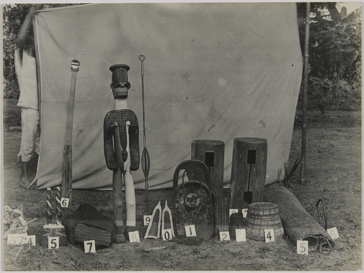 Assembling collections of artefacts was a key part of the anthropological surveys led by Northcote Thomas. During their fieldwork with Igbo-speaking communities in 1910-11, Thomas and his assistants arranged artefacts in front of a canvas backdrop and photographed them as they were collected.