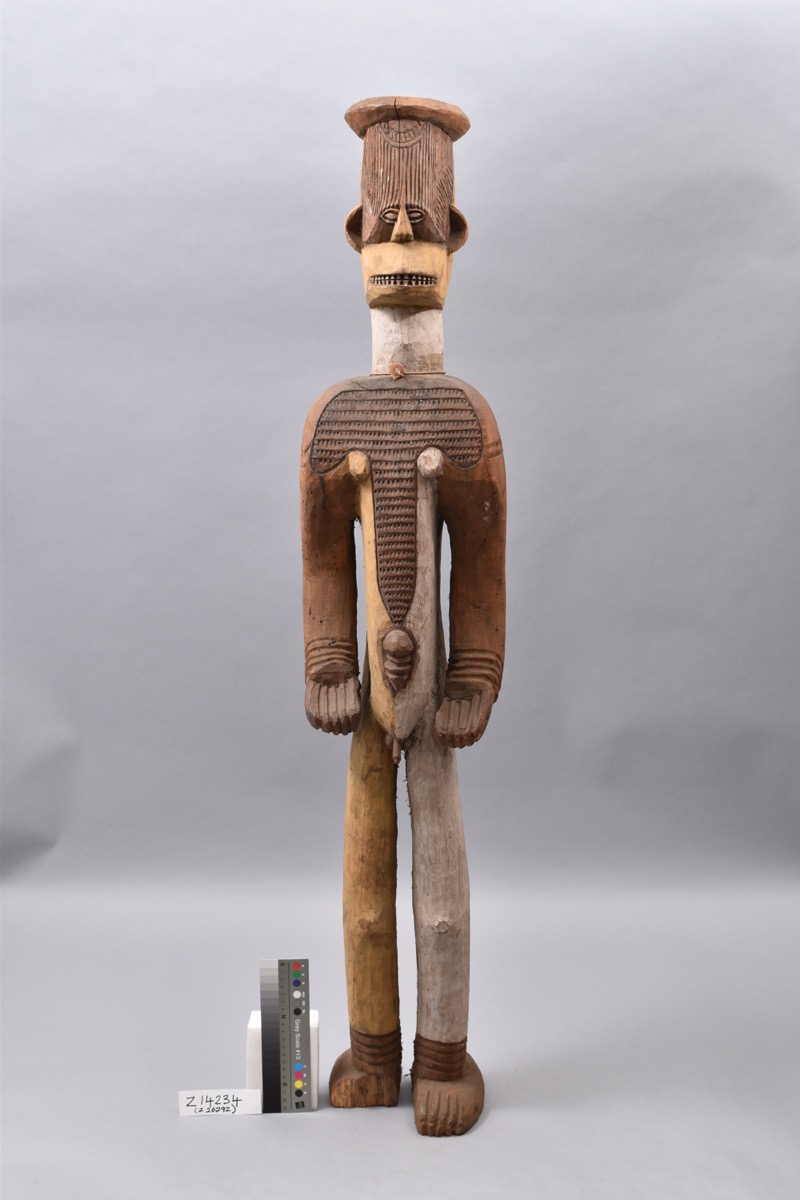 Catalogue card for Z 26292: Tall (approx 50"), thin, wooden figure of a man. Half the body is painted white, and half a yellowish colour. It has a very protuberant navel, small penis, and what appear to be small breasts (a hermaphrodite?). It has scarification marks (?) on chest and stomach. The figure has a long thin face and very high forehead.