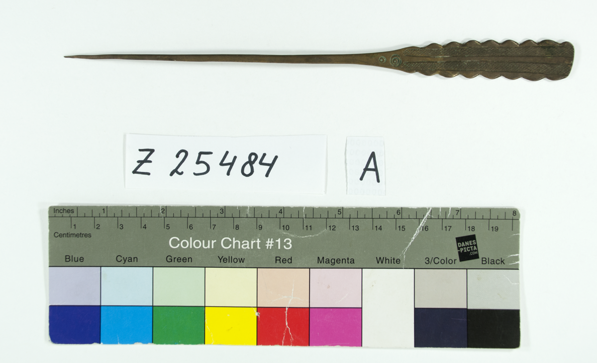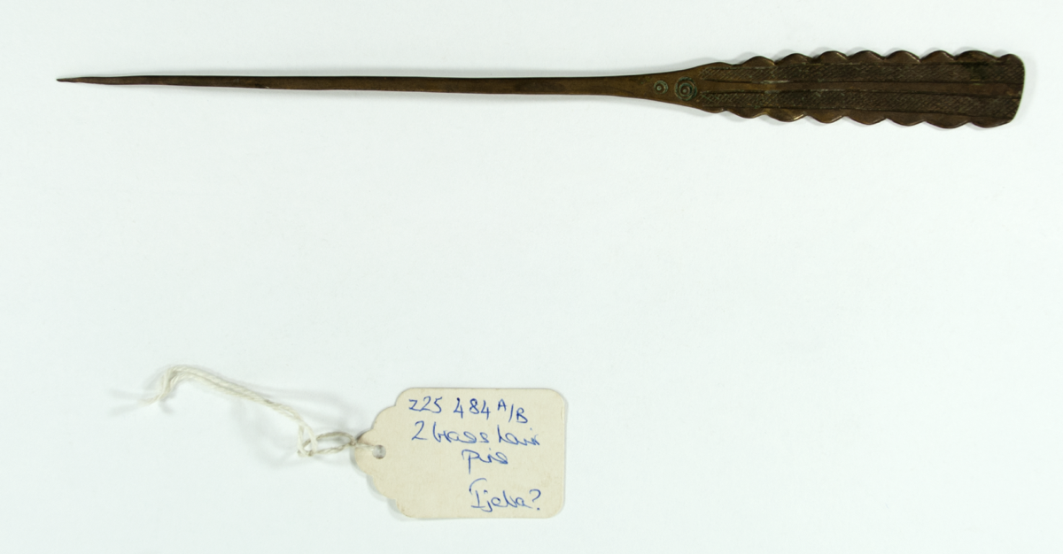 Brass hair pin ornament with irregular-pointed and curved sides at the top and incised pattern on one surface. cf Ijeba Z 12687.