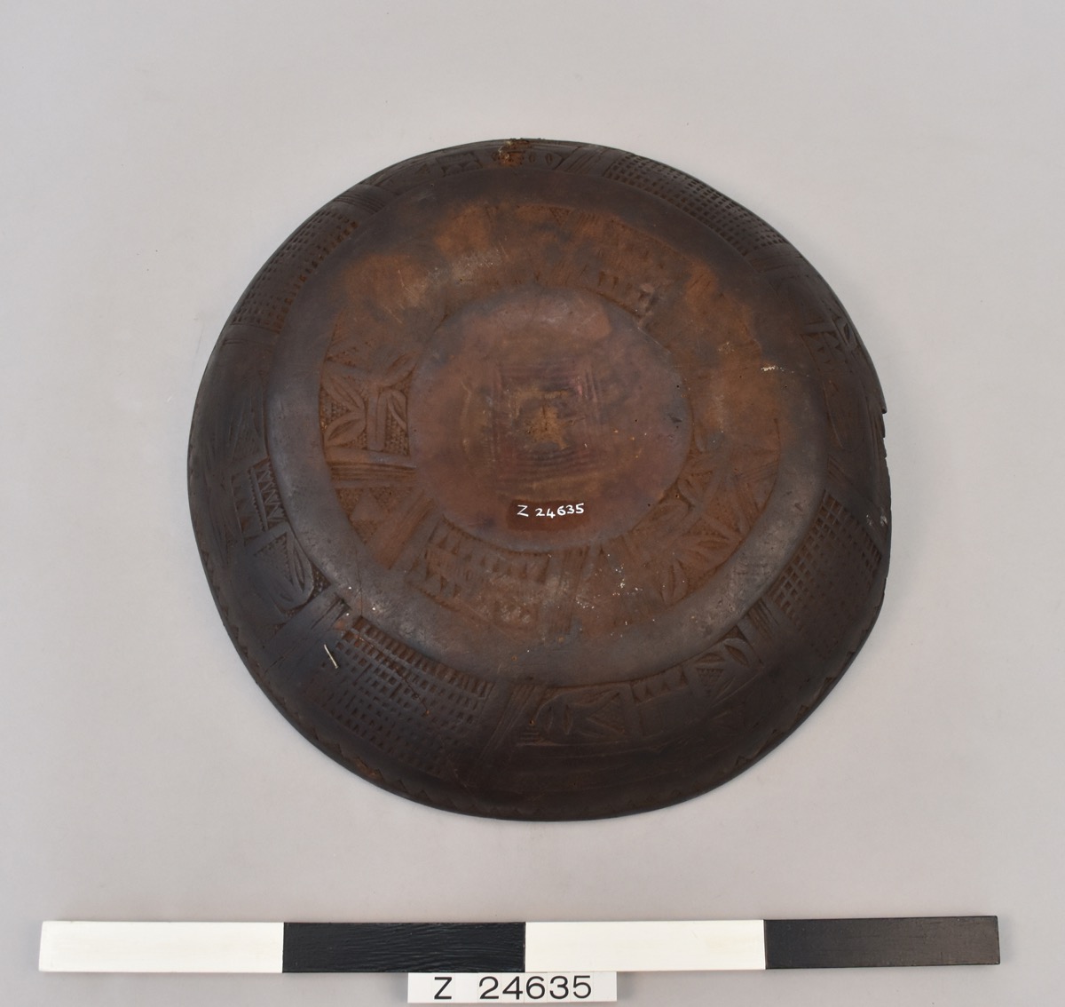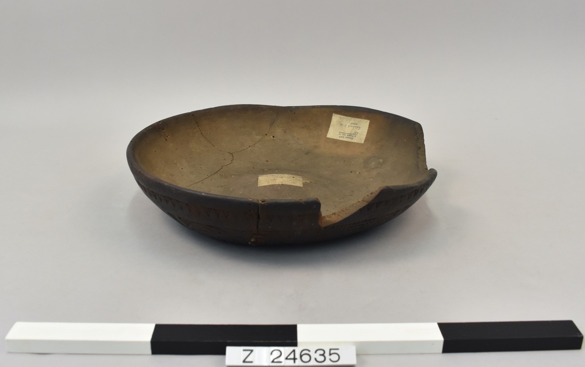 A calabash dish or a lid to a dish. With an upright rim and decoration on the body and base of the vessel. The rim has a zigzag cut out. Then a band of squares of alternating cross-hatching and geometric patterns. The base has a circular band of squares filled with geometric patterns that alternate with triangles filled with cross-hatching. Stained or possibly smoked dark brown. Two fragments have broken away from the rim, there is also a contemporary repair using cane.