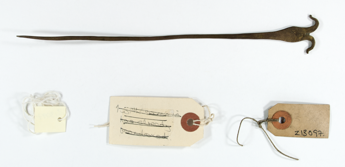 Description for Z 13097[.1-2]: Two brass hairpins. Flat design. 1 has two ram’s horns on the top, and from the top the pin tapers down into a point. 2 has unclear lines beaten in to it. Three spirals, aligned vertically are visible on either side of the head of the pin, beaten flat (six in total). The head of the hairpin is rounded. 2 is similar in design to Z 25485. Information provided by Dr Ohioma Pogoson, Honorary Curator of the Museum of the Institute for African Studies, University of Ibadan, Nigeria. January 2013.