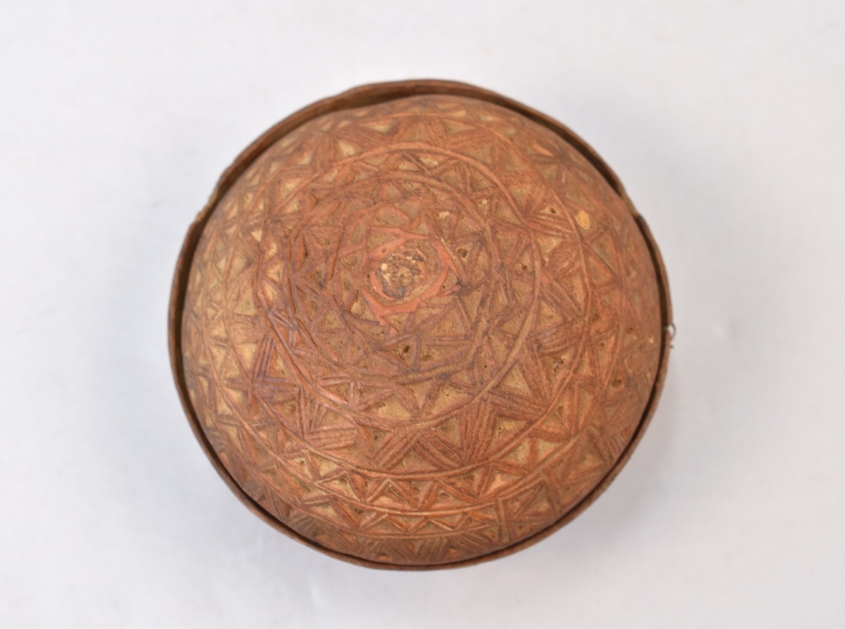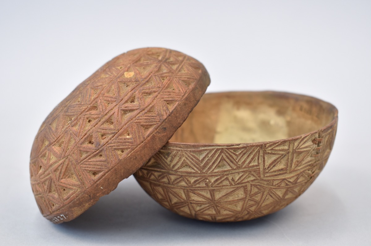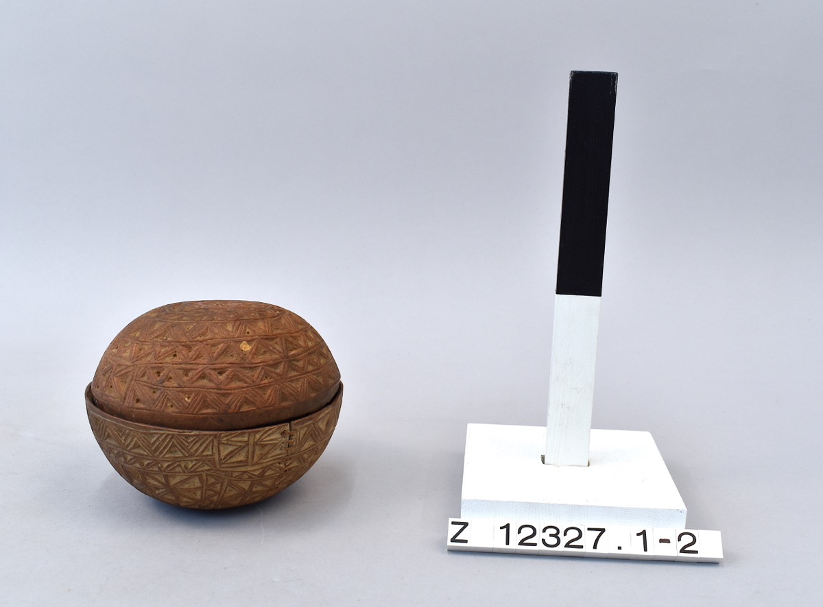 Carved circular gourd/calabash container. The lid (.1) is decorated with multiple zig zags between rows of horizontal lines. The base (.2) is carved with a star shaped pattern. Historic repair with fibre along crack.