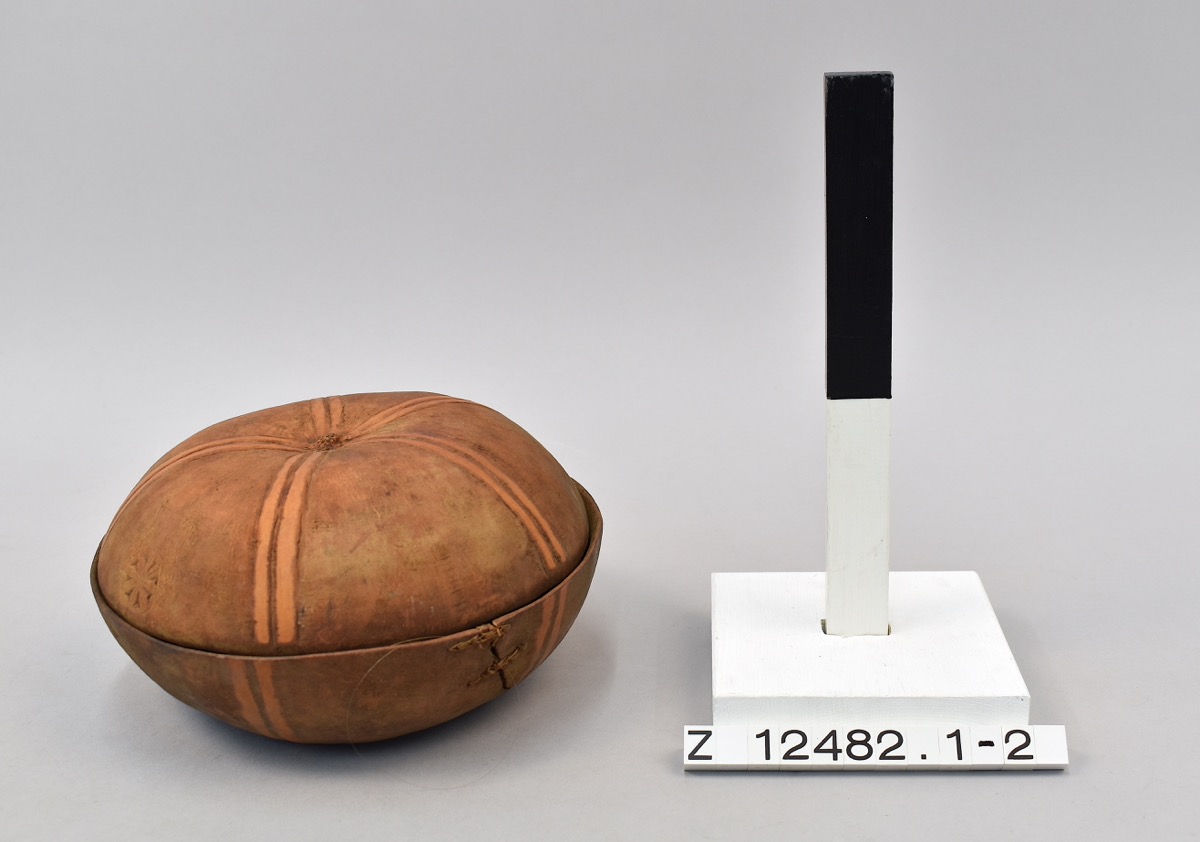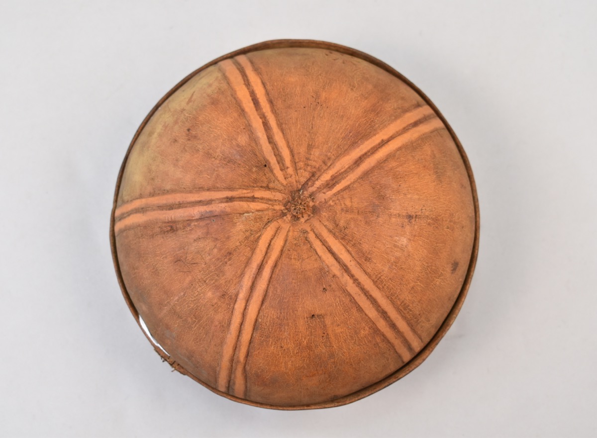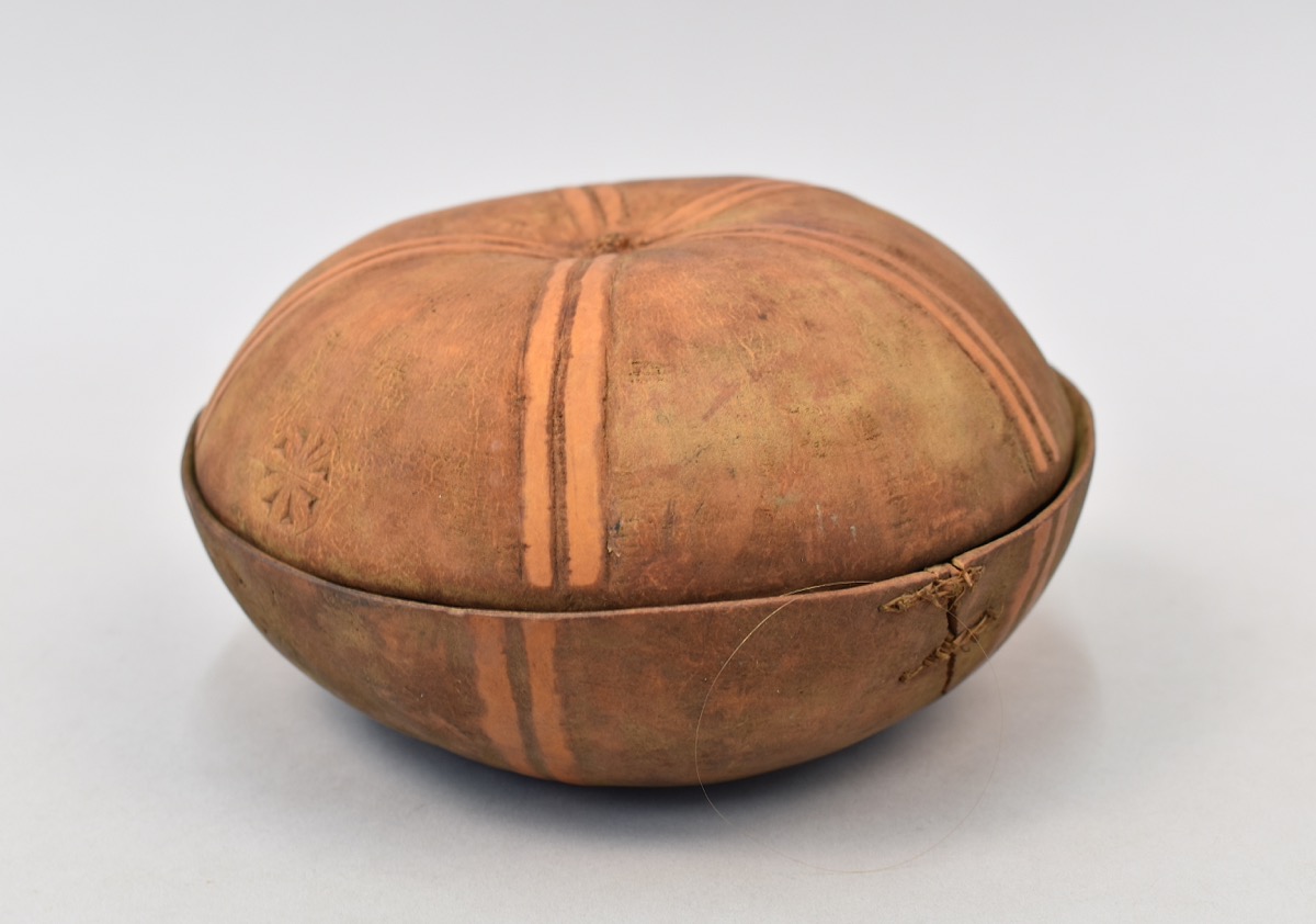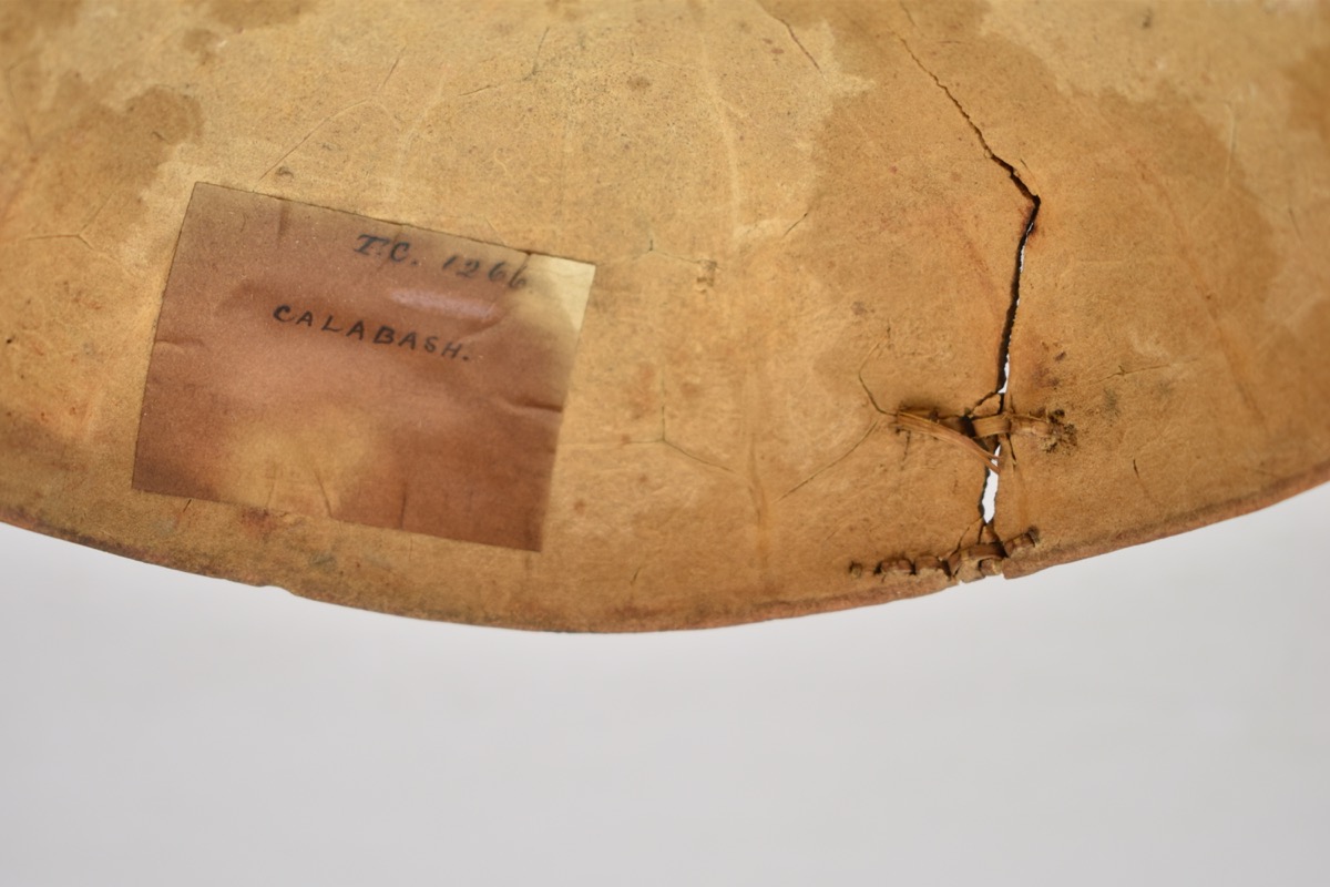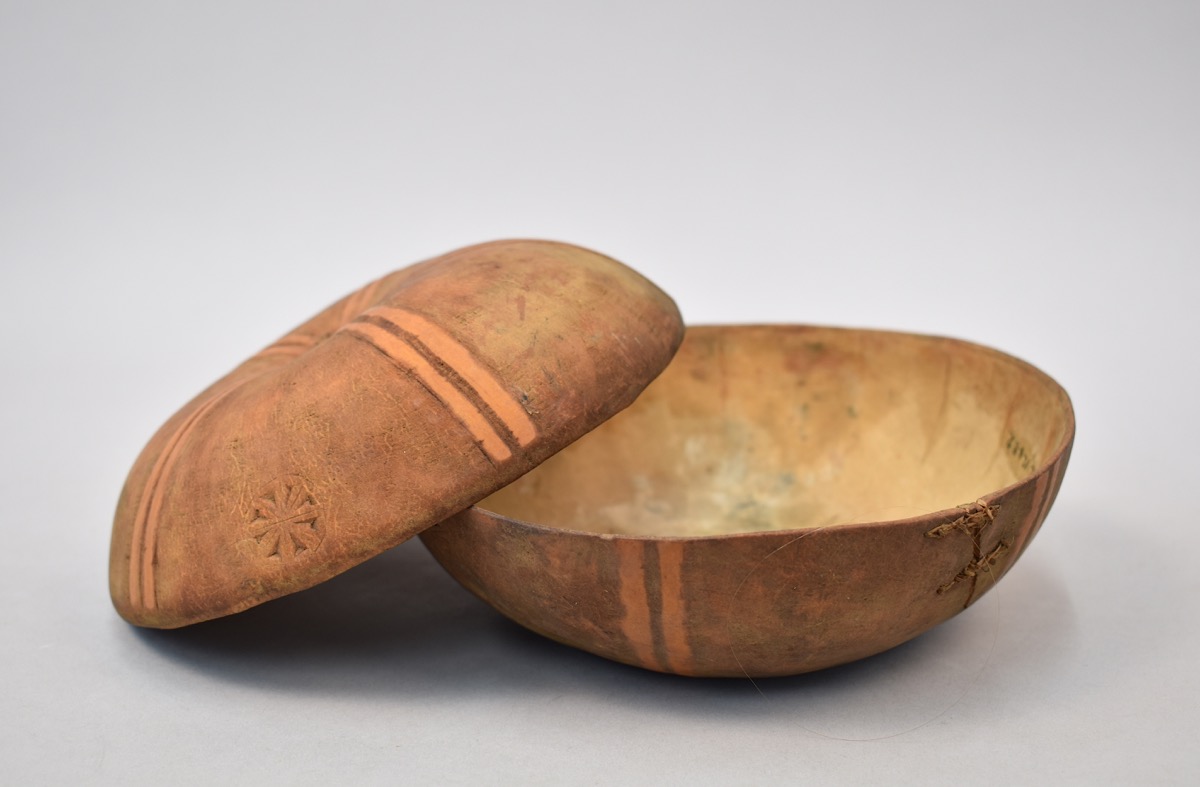 Carved calabash/gourd container. The lid (.1) and base (.2) are decorated on the outside with five sets of two vertical lines. Crack in base repaired with fibre in a historic repair.