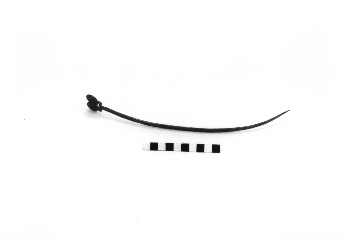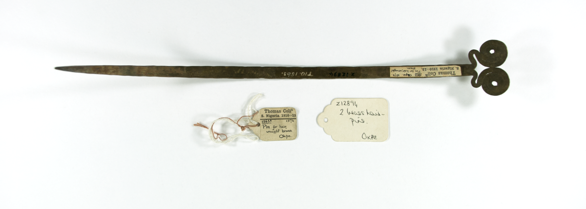Description for Z 12894[.1-2]: 1 is a curved (bow-like) brass hairpin with designs beaten onto the body such as dots, circles and lines. The pin tapers into a narrow point. At the head of the pin two spirals are situated next to each other, beaten down in a flat shape. Each spiral has a hole in the middle. 2 is a brass hairpin similar in design to 1 but no holes are present in the spirals and the beaten designs are spread out more. Neither pin has designs on the reverse side. Similar to Z 25492, Z 12505, Z 12372, Z 12847, Z 25463, Z 12921, Z 25492 and Z 25464 in design. It is important to note that all brass pins with this design are from Okpe, whereas the iron ones are from Ijeba. Information provided by Dr Ohioma Pogoson, Honorary Curator of the Museum of the Institute for African Studies, University of Ibadan, Nigeria. January 2013.