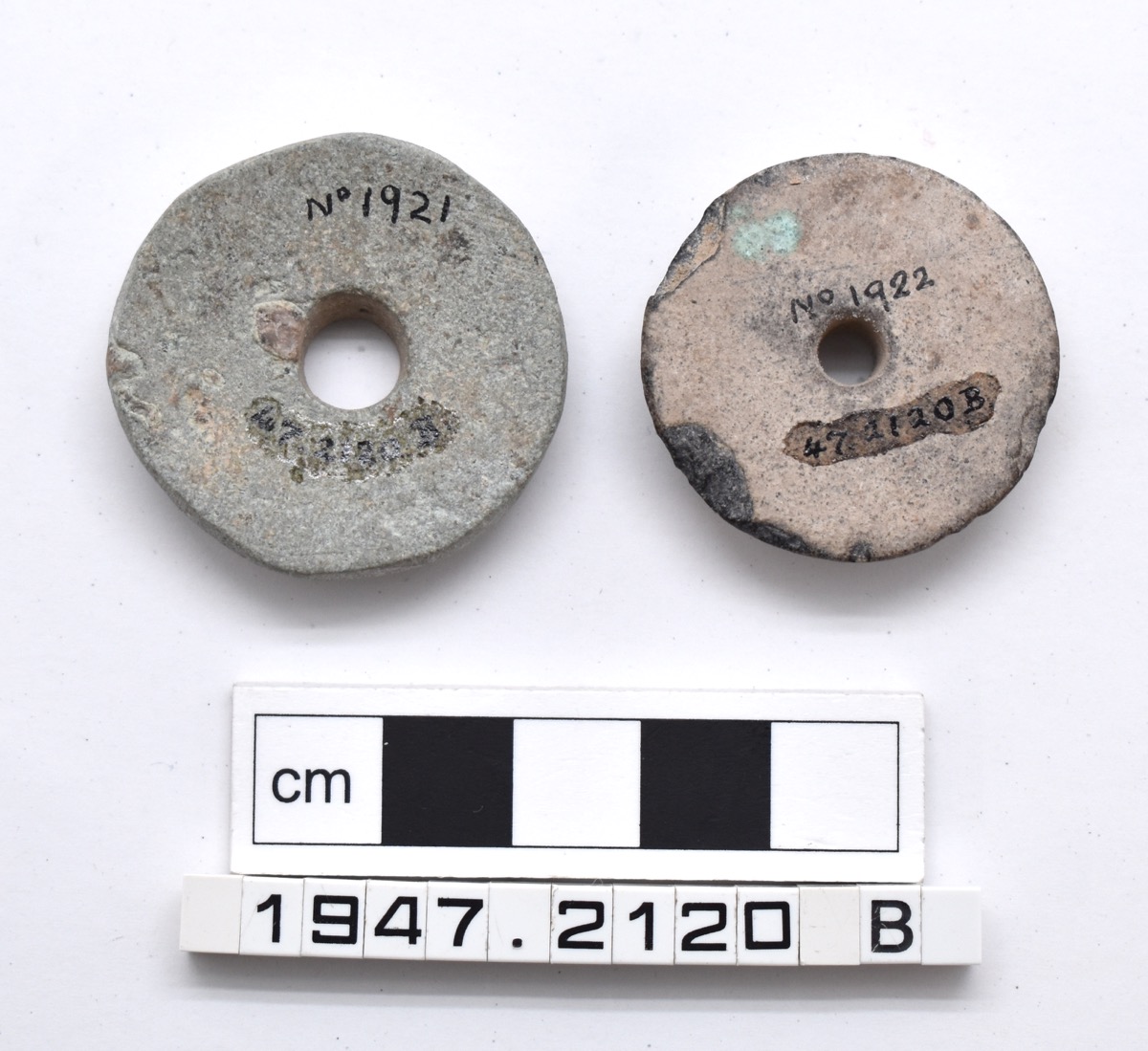 Catalogue card description for 1947.2120 B: 'Convex cone disc of sandstone and tiered disc bead of shale or slate.'