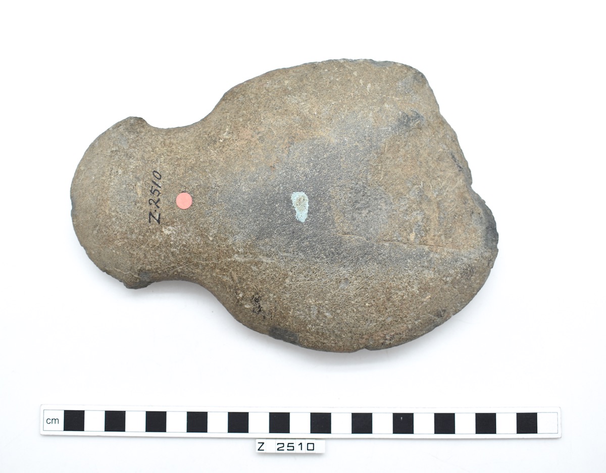 Large, notched axe made from a ground, dark grey coloured stone, possibly basalt. Blade is a large, thick lobe of lenticular cross-section with a chipped and bevelled area at the cutting edge on one face. Butt end is of a fish type: the base of the blade has a wide, rounded notch on each side ending in a small point; the butt is slightly expanded with a rounded edge and a lenticular cross-section.