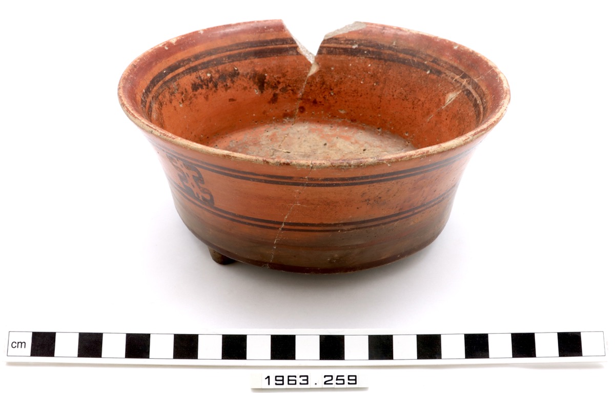 One flat-based tripod bowl of cream clay with orange slip and red and black painted decoration. Everted simple rounded rim; flaring body; obtuse angled slightly sagging base with three truncated solid conical feet. Interior painted decoration of red rim and two black horizontal lines; exterior painted decoration of black horizontal double lines framing a band of red and black painted meander lines. Reconstructed from sherds; small piece of rim missing.