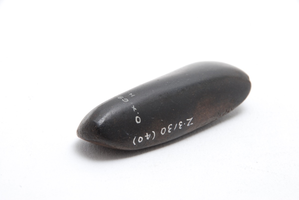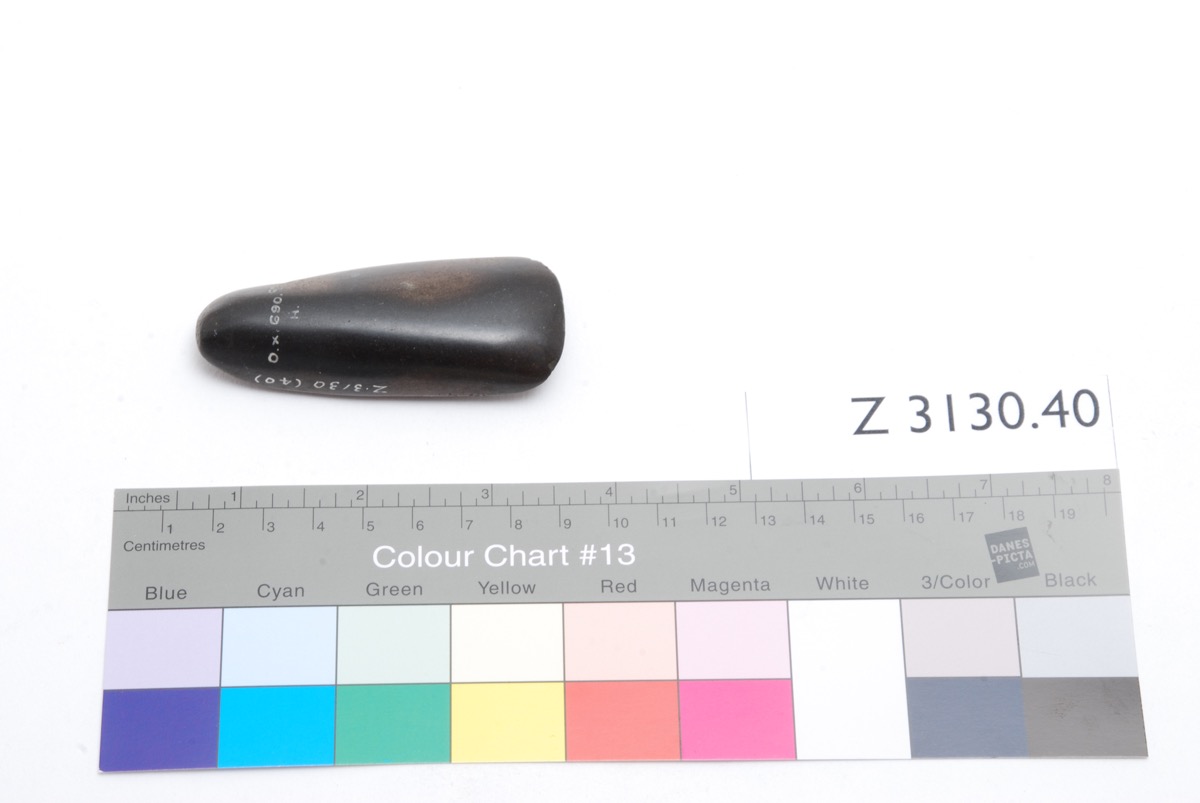 Labels & inscriptions: 'Z.3130 (40)' and 'O.X.690.69.H.' inscribed in white ink on the top of the adze head. '18' in a circle inscribed in pencil underneath the object.