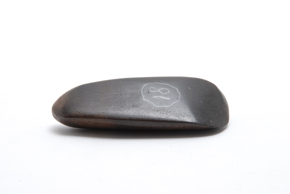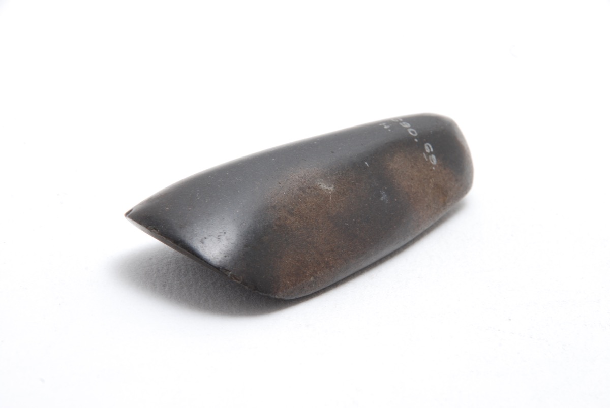 Small adze head of black stone. Trapezoidal in shape. Polished and smooth. Rounded tapering butt. Cutting edge formed by the surface slating at the top and bevelled on the underside.