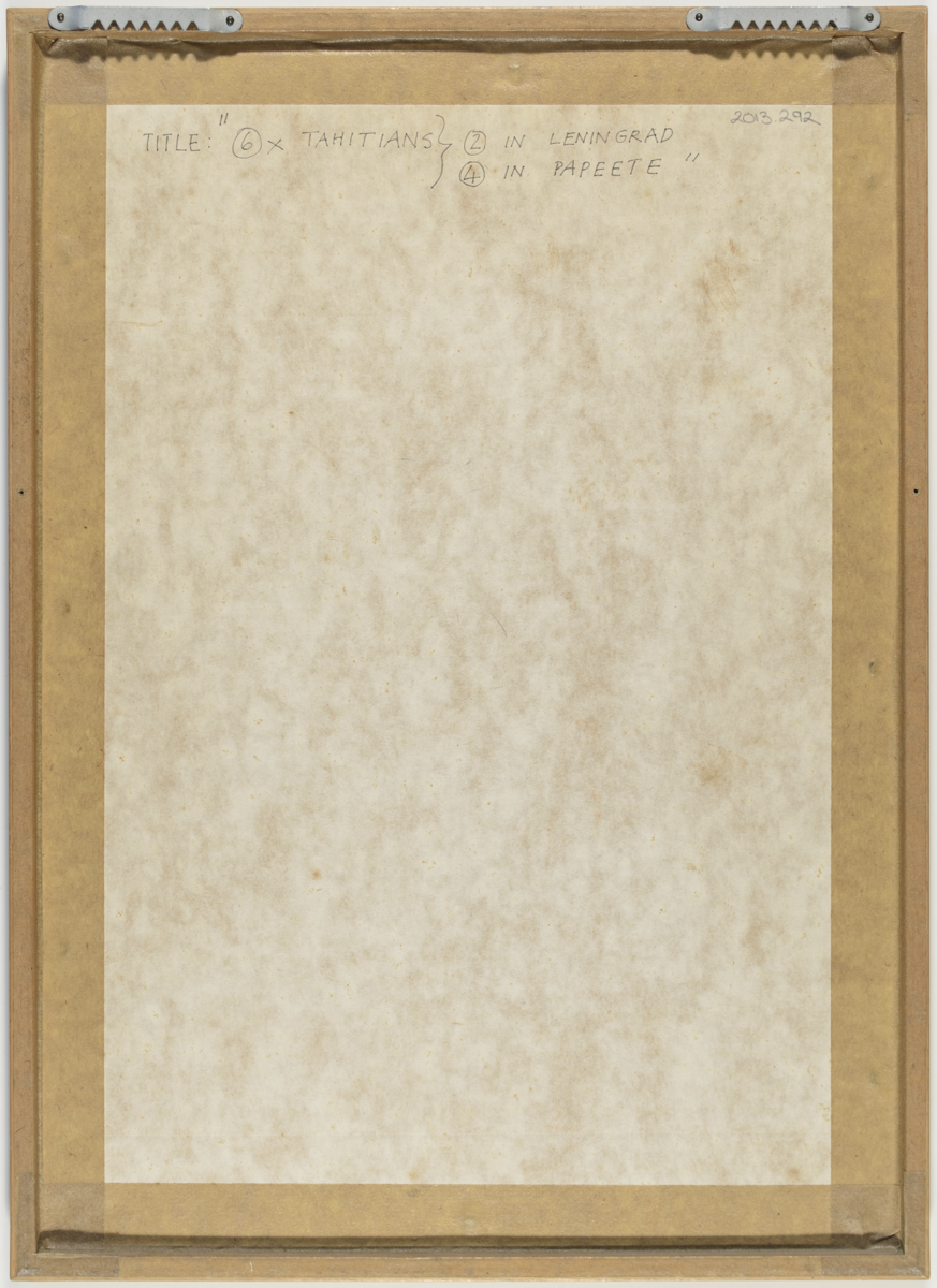 Framed digital print of '6 Tahitians: 2 in Leningrad 4 in Papeete' (1990) by Jim Vivieaere. The work incorporates a monochrome reproduction of a Paul Gauguin painting set above a colonial postcard.