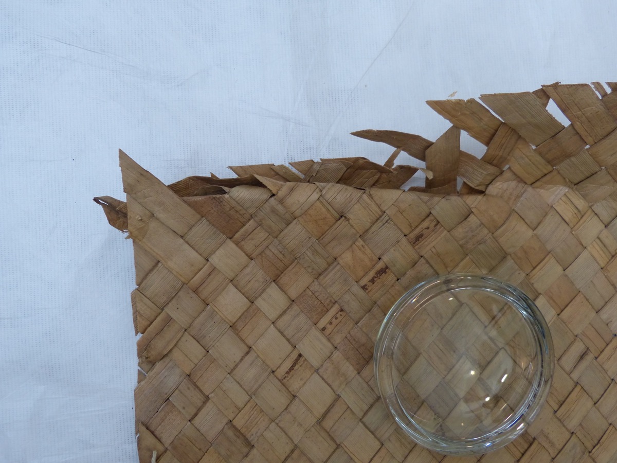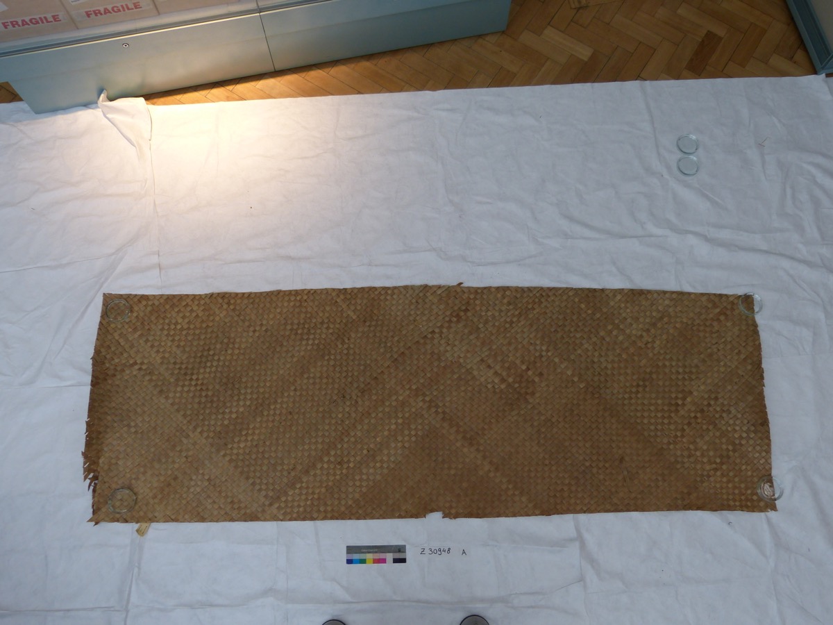 Mat of woven pandanus (voivoi). Originally part of a larger mat and cut on all sides. No decoration or border visible. Poor condition. Possibly from same mat as Z 30948 B & C.