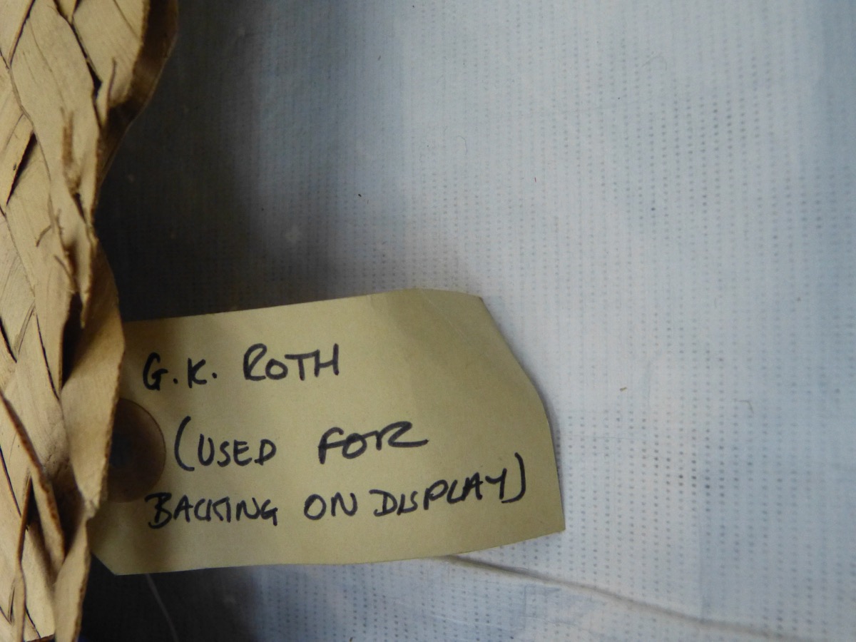 Labels & inscriptions: A modern rectangular cream label attached to the edge of the mat reads [handwritten in black ink:] 'Z 30948 MAT FIJI' on one side and 'G. K. ROTH (used for backing on display).'