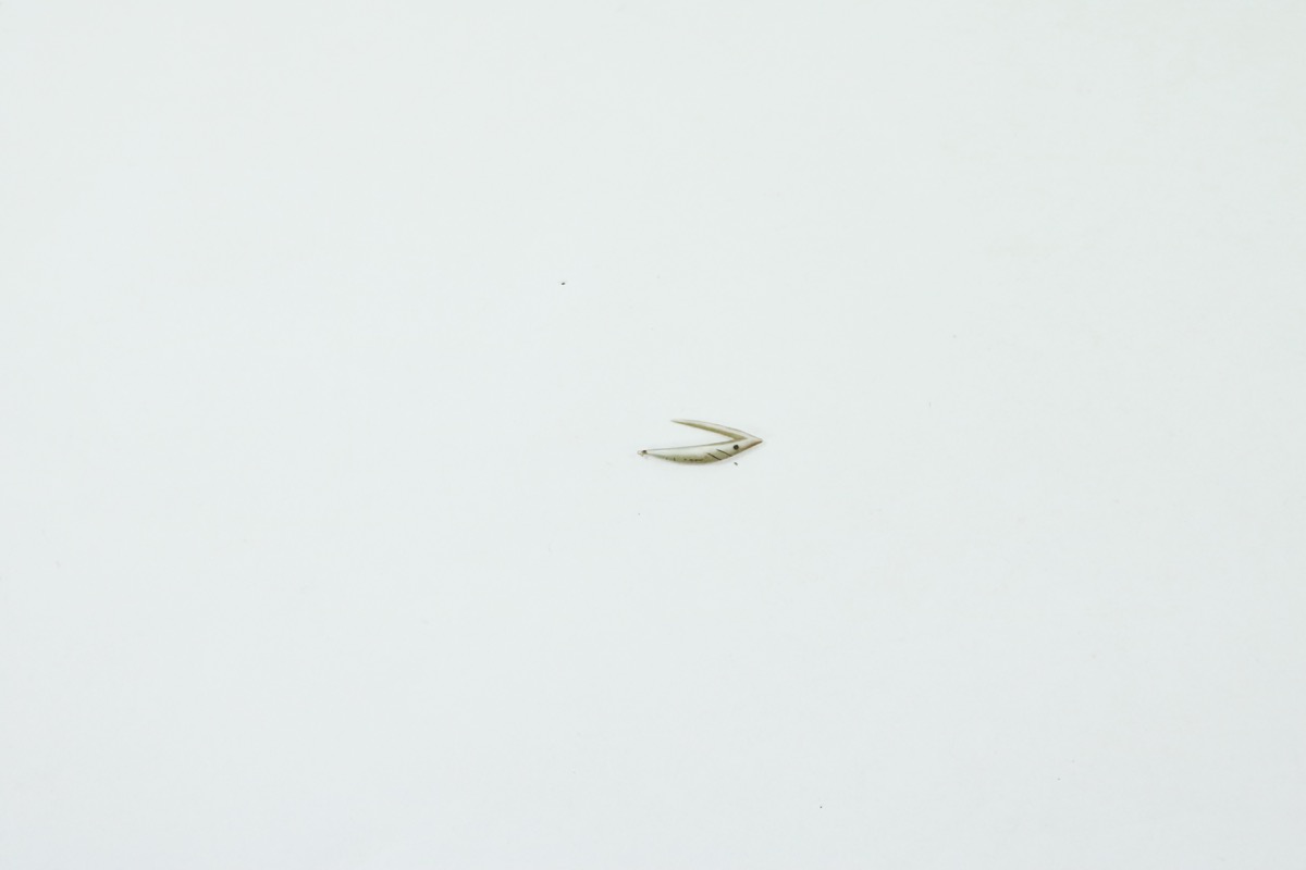 Small fishhook of mother of pearl, carved in the shape of a fish and decorated with an incised dot for an eye and two incised lines for gills on both side.