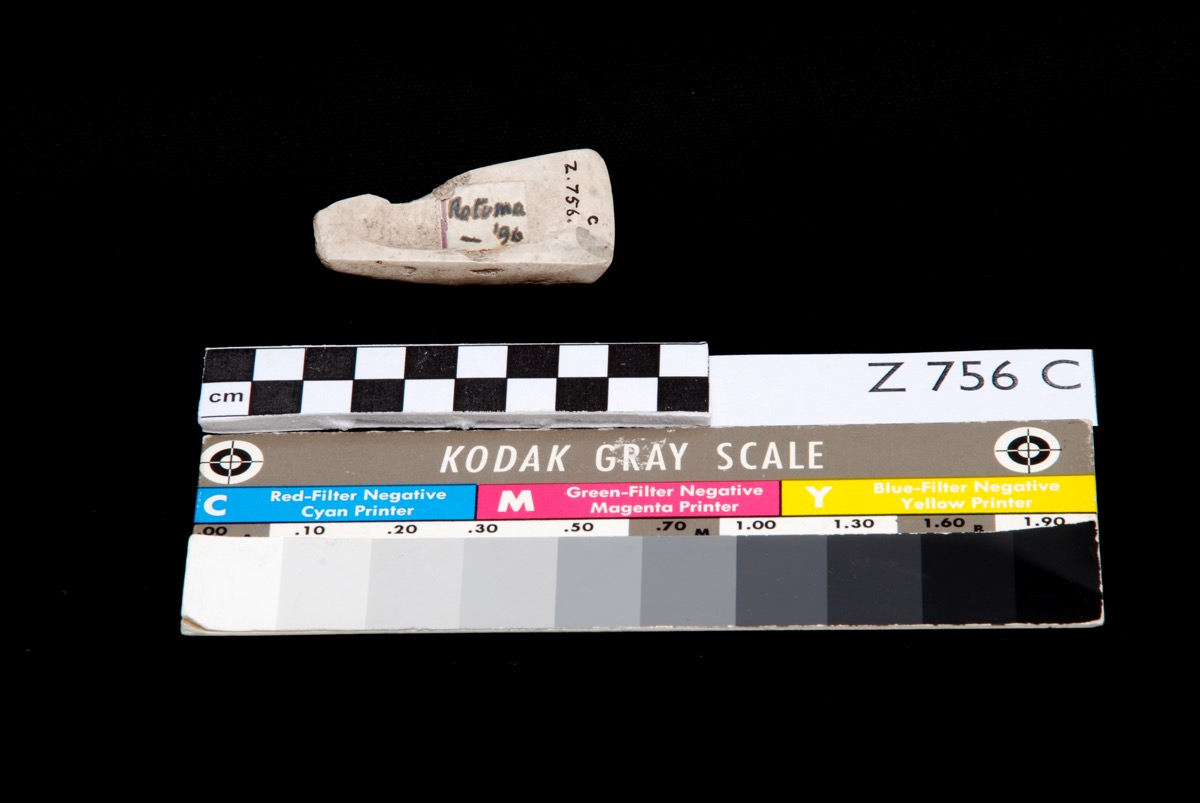 Catalogue card reads [handwritten in black ink:] 'Z 756.a-d. Rotuma. Four Tridacna shell adze-blades. Cf. J.A.I. vol 27, p.460. c&d Prof. Stanley Gardiner'. A small round red sticker pasted to the front of the card.