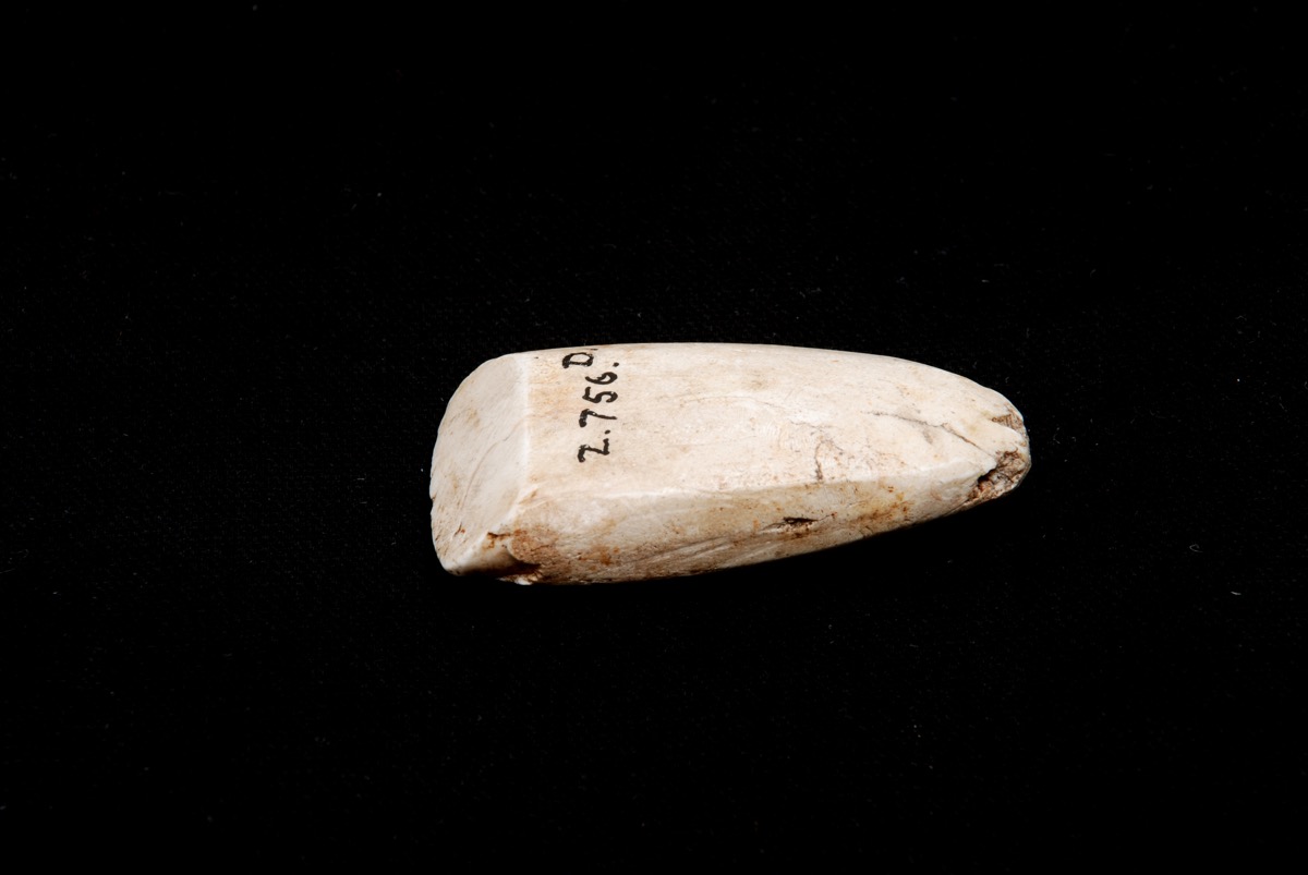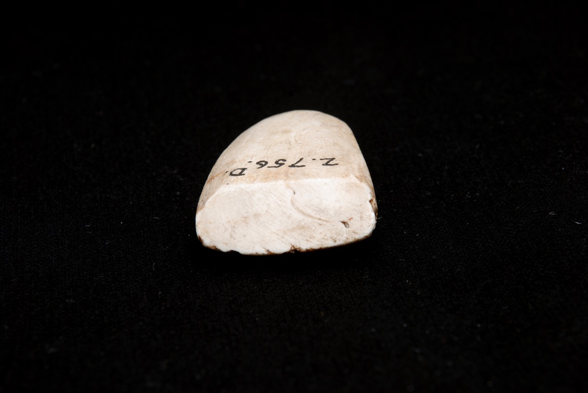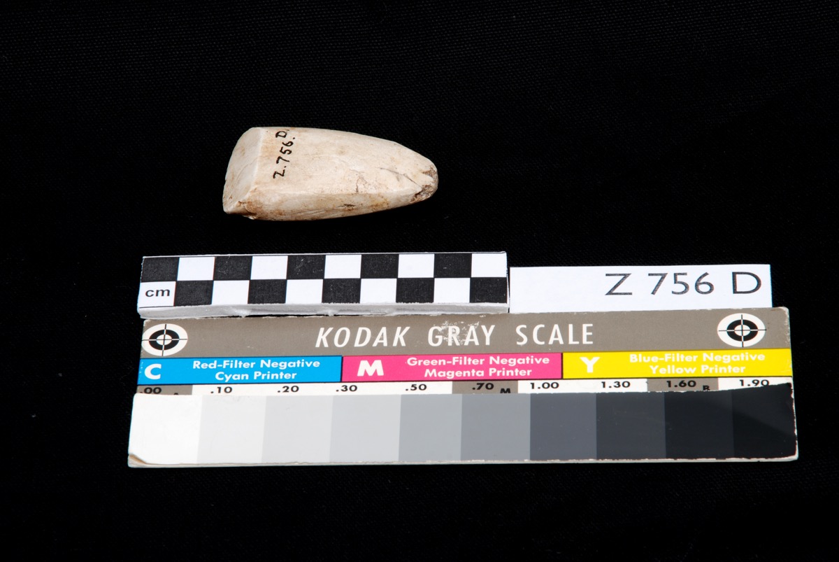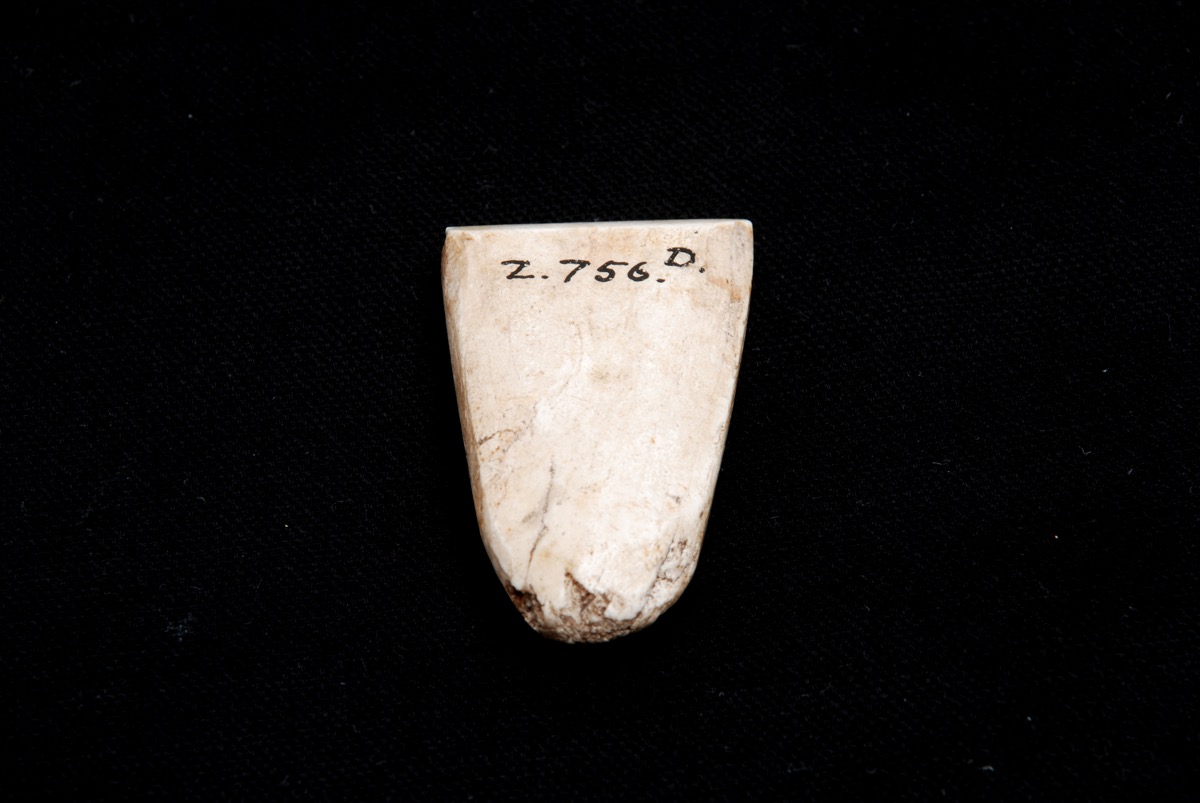 Catalogue card reads [handwritten in black ink:] 'Z 756.a-d. Rotuma. Four Tridacna shell adze-blades. Cf. J.A.I. vol 27, p.460. c&d Prof. Stanley Gardiner'. A small round red sticker pasted to the front of the card.