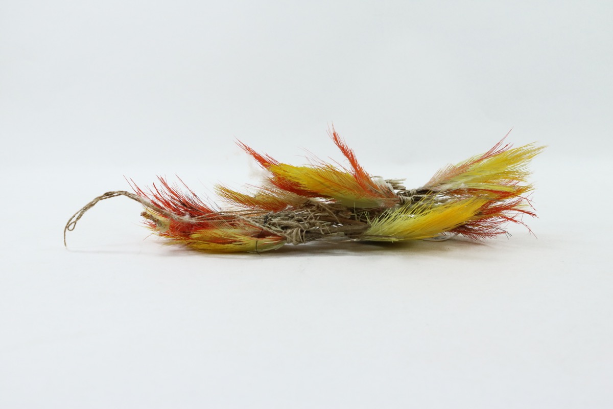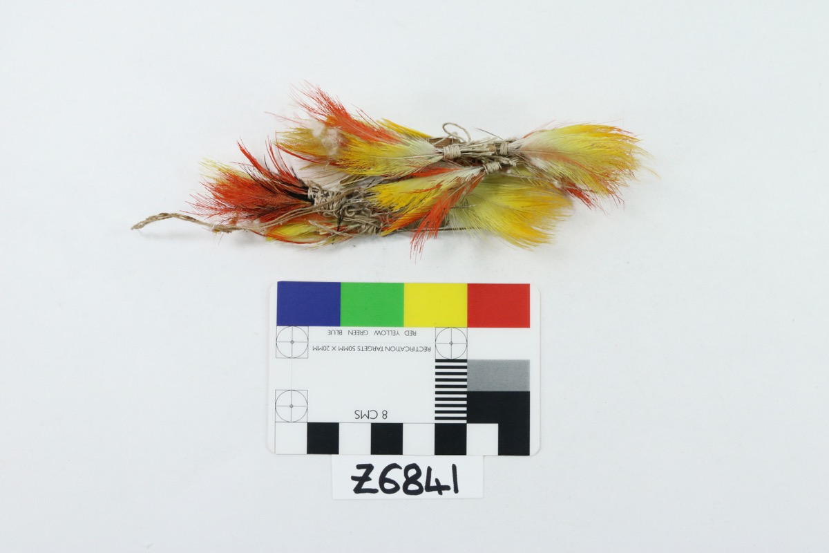 Catalogue card for Z 6841: 'Group of coloured feather for bait'.