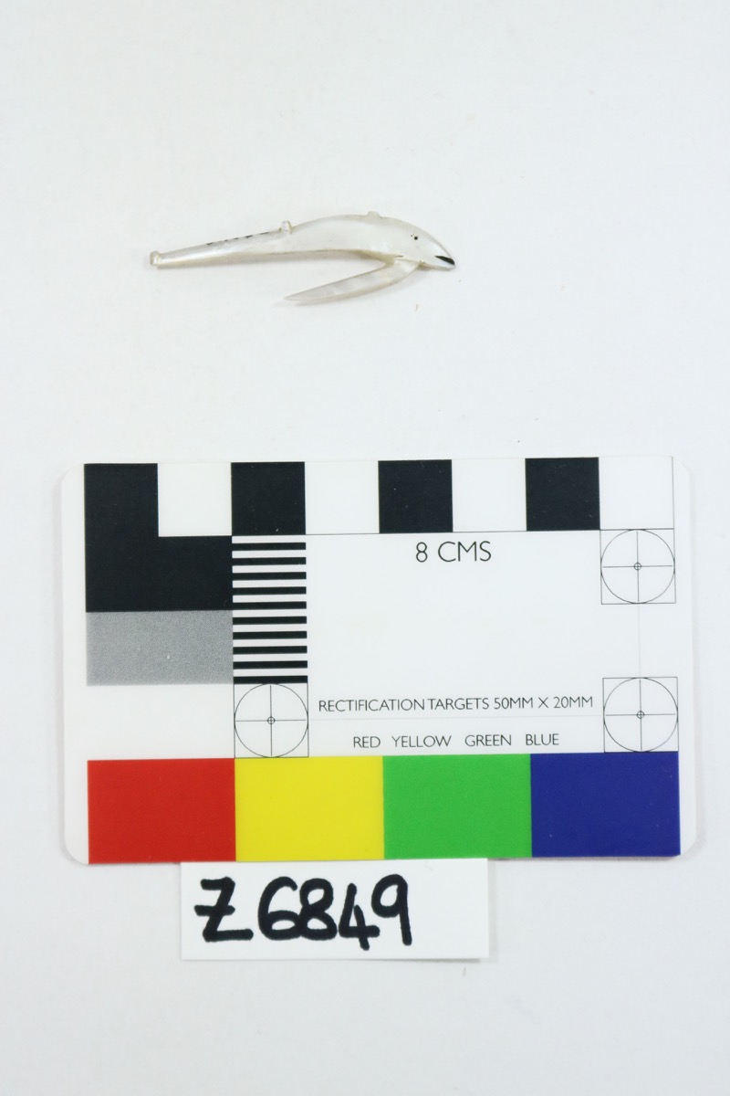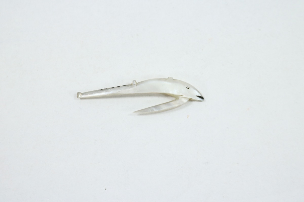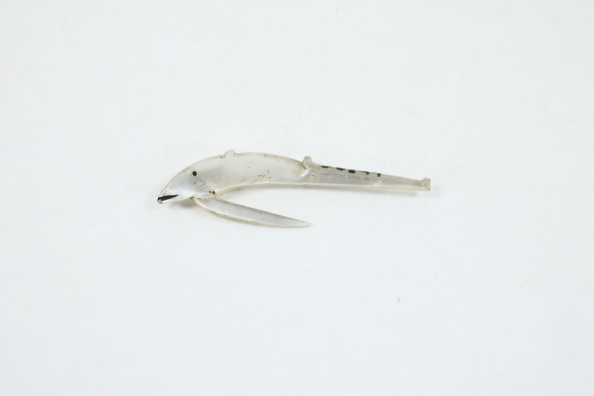 Small fish hook of mother of pearl, carved in the shape of a fish. An incised dot and line filled in black represent the eye and mouth of the fish.