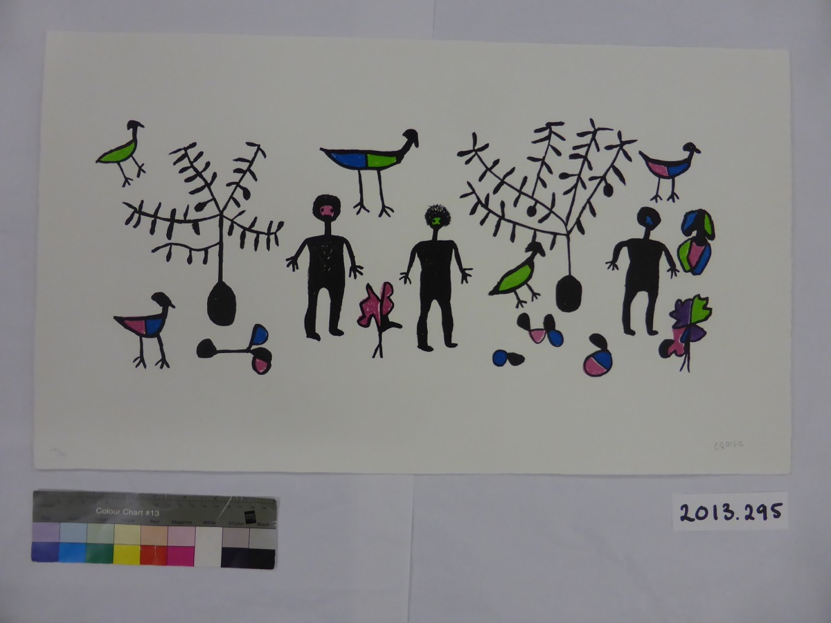Presented by The Art Fund and the Esmée Fairbairn Foundation. An acquisition project to build a collection of modern and contemporary work on paper from Australia, Canada and South Africa was undertaken over 2011-13 with the support of a grant under The Art Fund's RENEW programme. The collection was developed with the expert advice and generous assistance of Annie Coombes and Norman Vorano in relation to South African and Inuit artists respectively. Khadija Carroll, Anita Herle and Diana Wood Conroy also contributed to the selection process. Obtained from the Kuru Development Trust, Ghanzi, Botswana, November 2013.