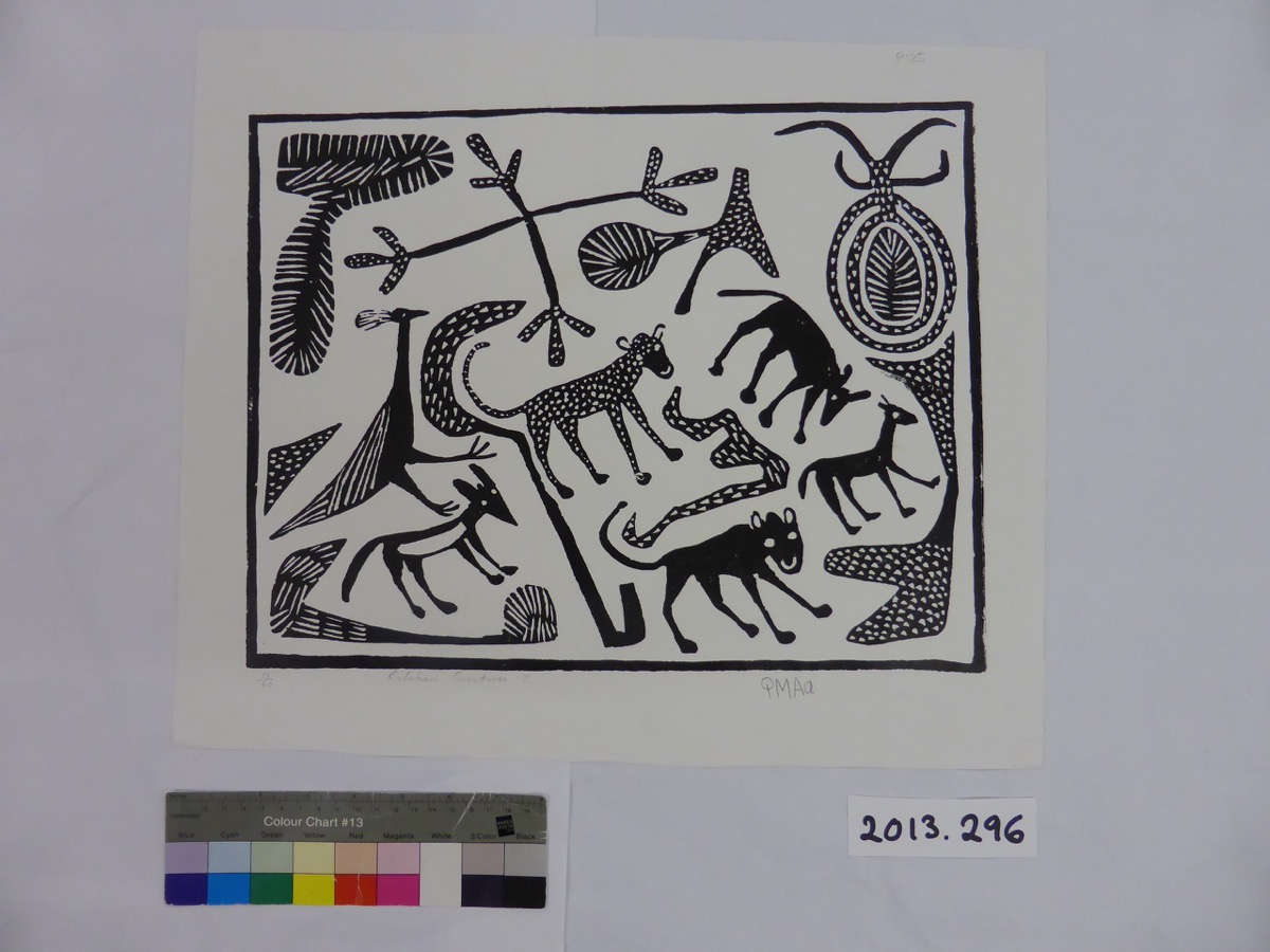 Presented by The Art Fund and the Esmée Fairbairn Foundation. An acquisition project to build a collection of modern and contemporary work on paper from Australia, Canada and South Africa was undertaken over 2011-13 with the support of a grant under The Art Fund's RENEW programme. The collection was developed with the expert advice and generous assistance of Annie Coombes and Norman Vorano in relation to South African and Inuit artists respectively. Khadija Carroll, Anita Herle and Diana Wood Conroy also contributed to the selection process. Obtained from the Kuru Development Trust, Ghanzi, Botswana, November 2013.