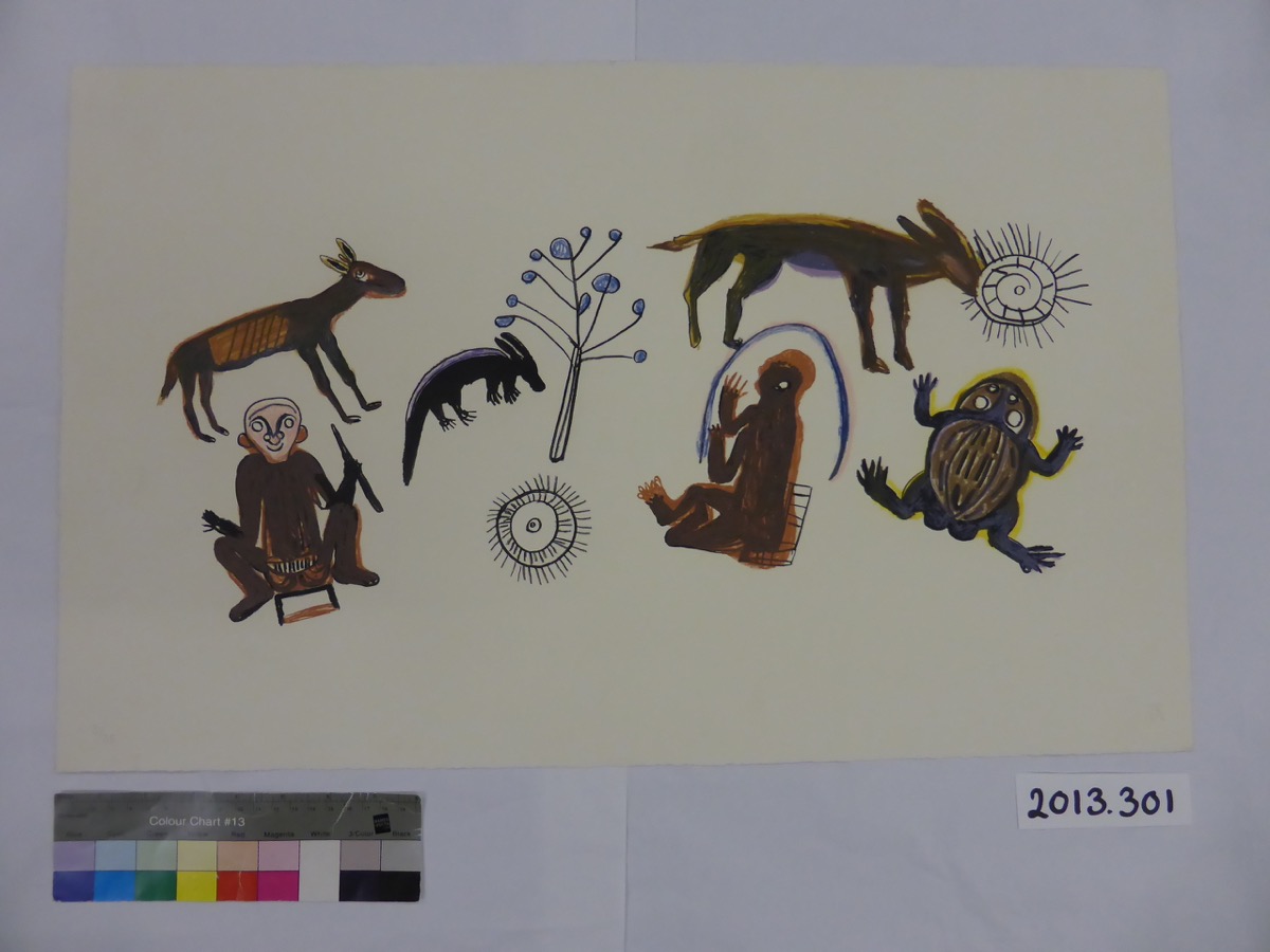 Exhibited: 'Crafting Colour: Beads, Pattern and Painting from the Kalahari', Cambridge MAA South Lecture Room, 24 June 2014 - 28 September 2014. Presented by the Esmée Fairbairn Foundation. The display label text read: 'In 1994 the artists from Kuru created pictures to illustrate a book, telling the traditional story of Qauqau. Here Qauqau is shown heating up her needle, with which she will kill her husband, Duu, shown playing the musical bow.'