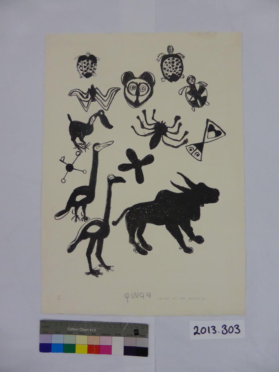 Presented by The Art Fund and the Esmée Fairbairn Foundation. An acquisition project to build a collection of modern and contemporary work on paper from Australia, Canada and South Africa was undertaken over 2011-13 with the support of a grant under The Art Fund's RENEW programme. The collection was developed with the expert advice and generous assistance of Annie Coombes and Norman Vorano in relation to South African and Inuit artists respectively. Khadija Carroll, Anita Herle and Diana Wood Conroy also contributed to the selection process. Obtained from the Kuru Development Trust, Ghanzi, Botswana, November 2013.