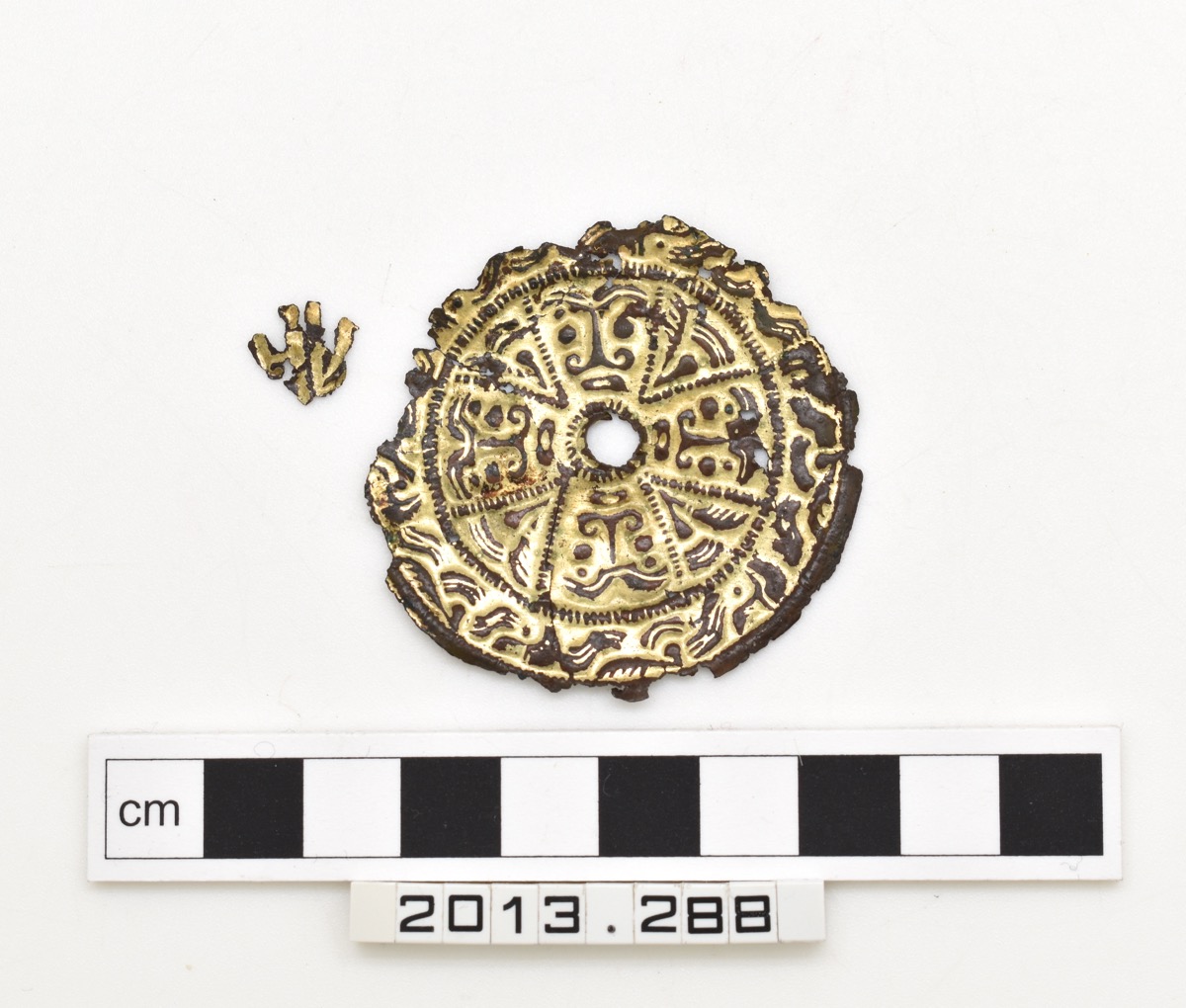 Gilt copper alloy stamped foil of applied saucer brooch. Style I decoration: outer ring of zoomorphic running design, enclosing a central disc divided into four wedge-shaped quadrants each containing a full-face mask, and four smaller wedges with zoomorphic elements. Detached from backing, with central hole; edges damaged and one piece detached but present.