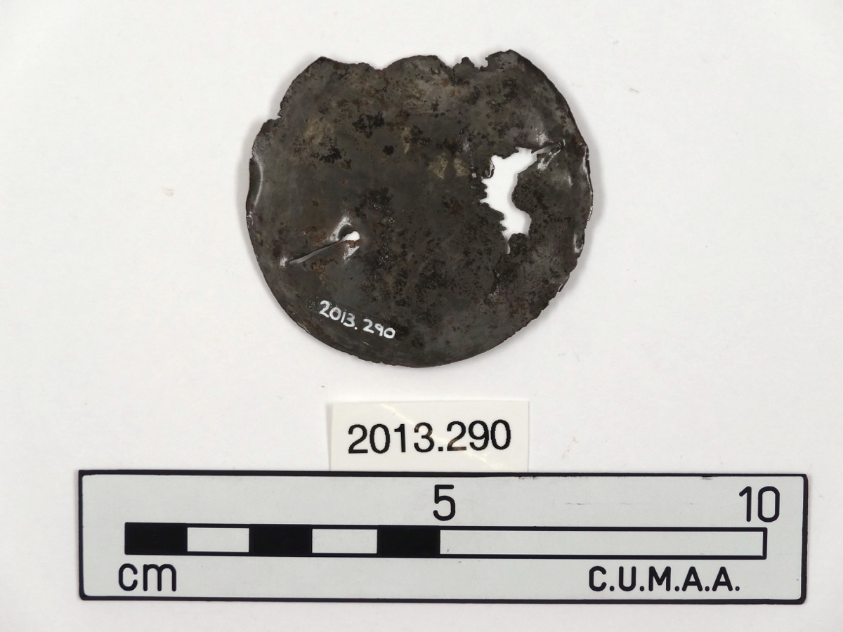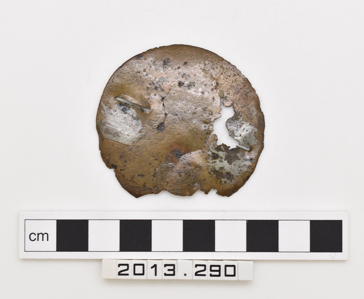 Thin bronze back plate of an applied saucer brooch; damage around edge and around one slot for clasp. The second rectangular slot extant.