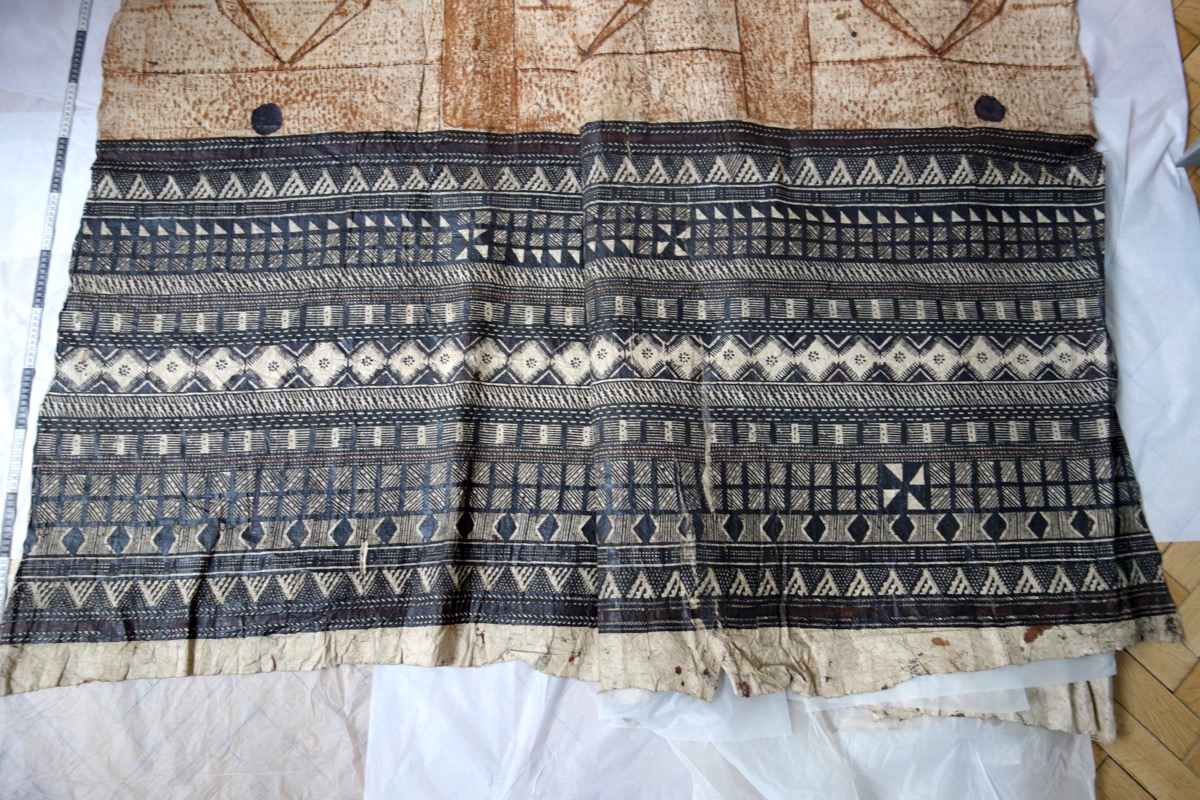 Barkcloth. Large cloth used in a Lauan marriage. Comparatively recent. Rubbed in light brown, stencilled in b&w.