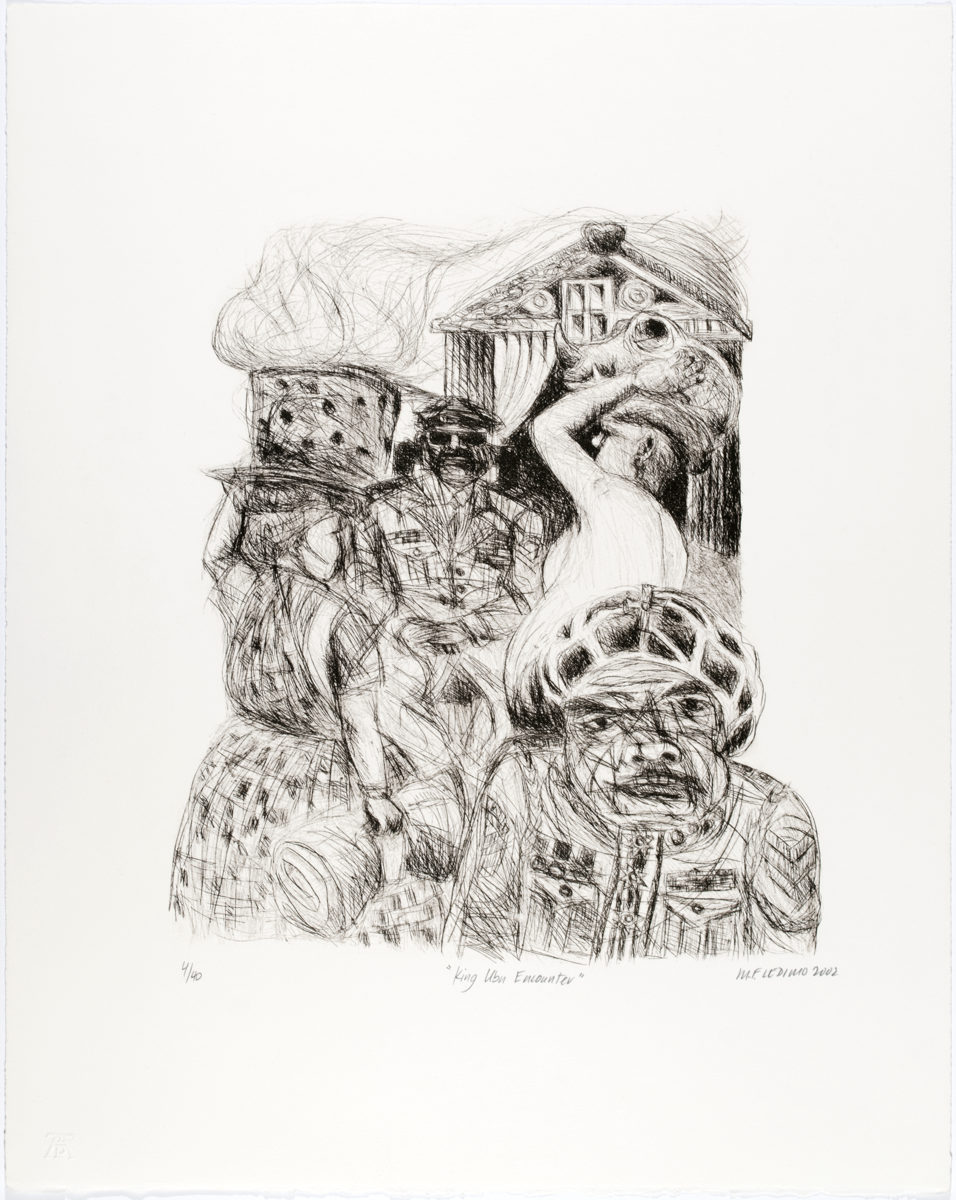 Single coloured lithograph by Frank Ledimo, signed and inscribed by the artist, titled 'King Ubu Encounter', 2002. Edition 4/40. Condition: excellent