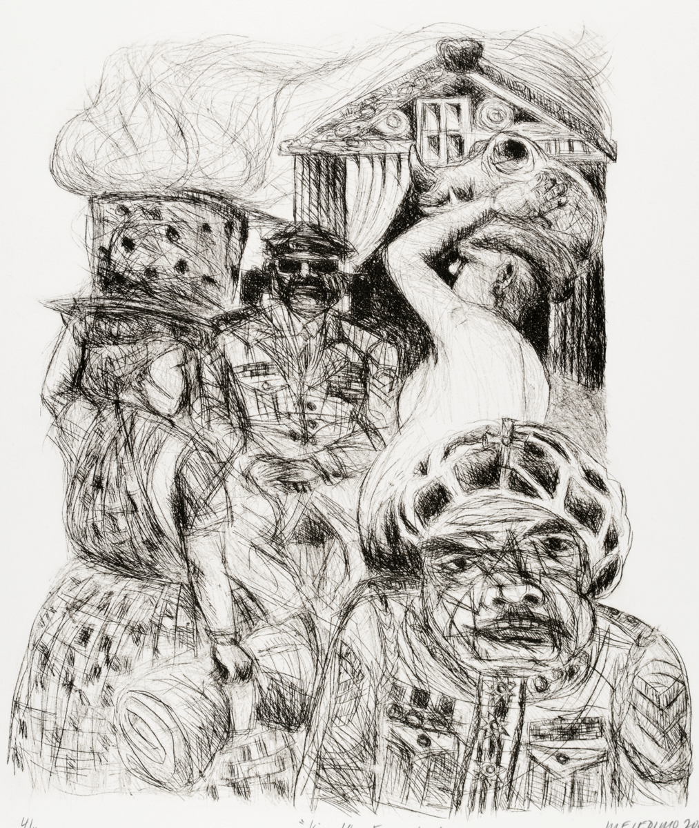 In this print, Alfred Jarry's Ubu Roi is recast in the South African context. The themes of despotism, greed, self-gratification, dishonesty, and exploitation and needless to say highly resonant in the Apartheid and African contexts.