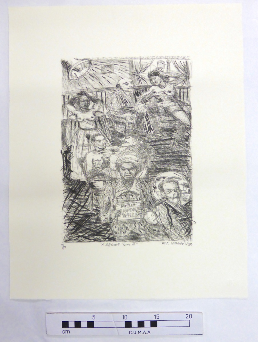 Frank Ledimo, a contemporary of David Koloane's, has been an important figure in South African printmaking for decades, through his involvement with Artist Proof Studio in Johannesburg and other printmaking initiatives. He depicts nightlife and sexual squalor, implying a wider social world pervaded by depravity, cruelty and exploitation.