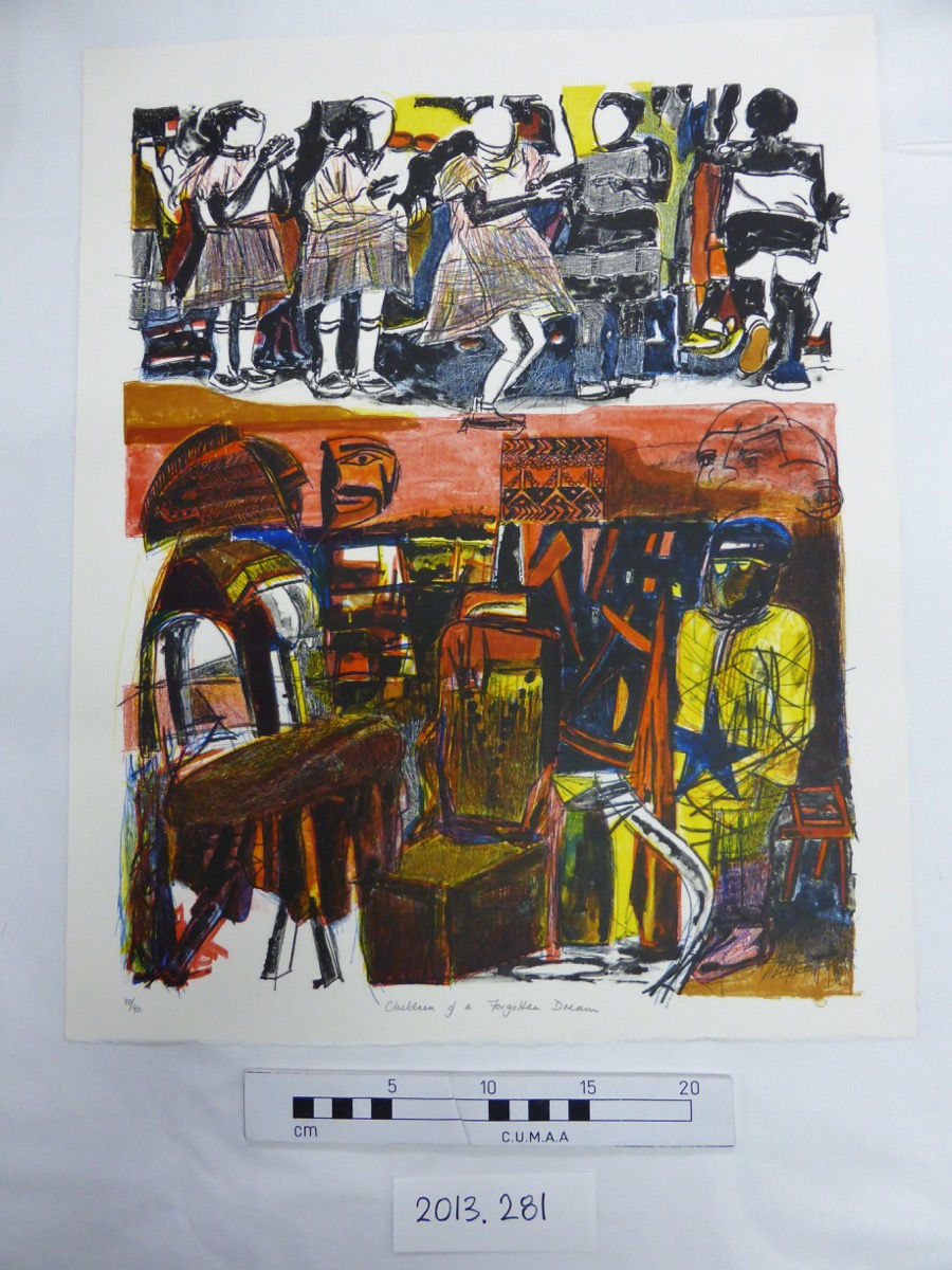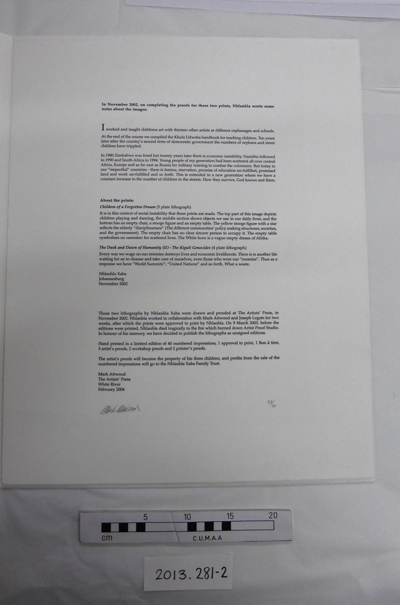 Print; Lithograph - Four colour lithograph by Nhlanhla Xaba, titled 'Children of a forgotten dream', 2002. Edition 33/40. 2013.281.1 and 2013.282 comprise a portfolio of two works titled 'Children of a Forgotten Dream', 2002. 2013.281.2-3 are the folder and notes included with the two artworks.