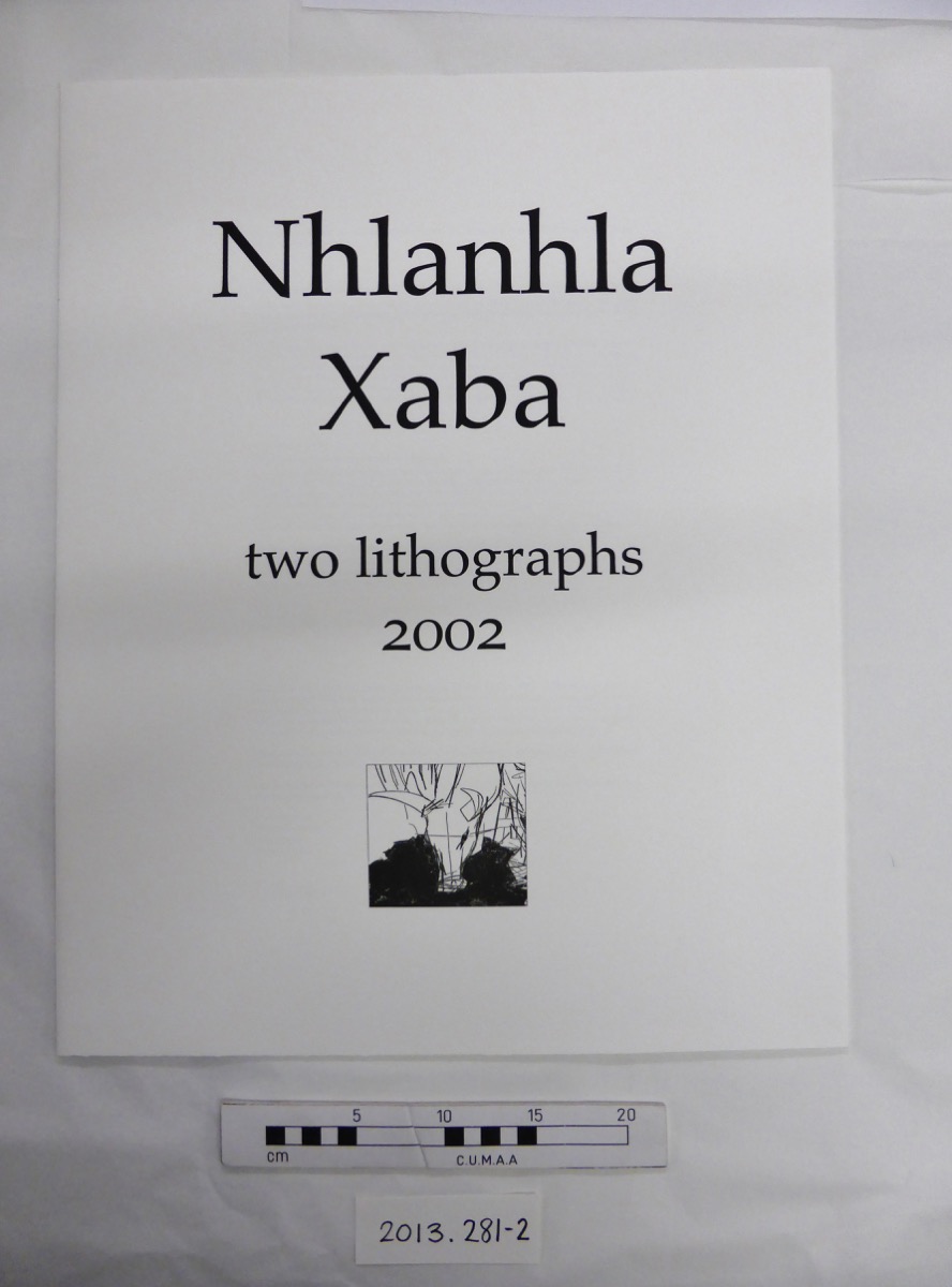 2013.281.1 and 2013.282 are in a folder titled 'Nhlanhla Xaba two lithographs 2002'. Accompanied by printed notes by Nhlanhla about the images, subsequently printed by Mark Attwood, the artists' press, February 2004. edition number 33/40.