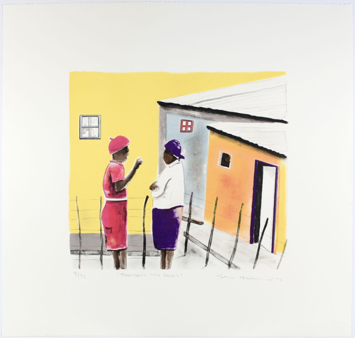Print; Lithograph - Seven colour lithograph by Sam Nhlengethwa, inscribed, signed and fated by the artist. Titled, 'Precisely my point', 2012. Edition 9/35. With 'TAP.11-46' written on the rear in pencil. Condition: Excellent.