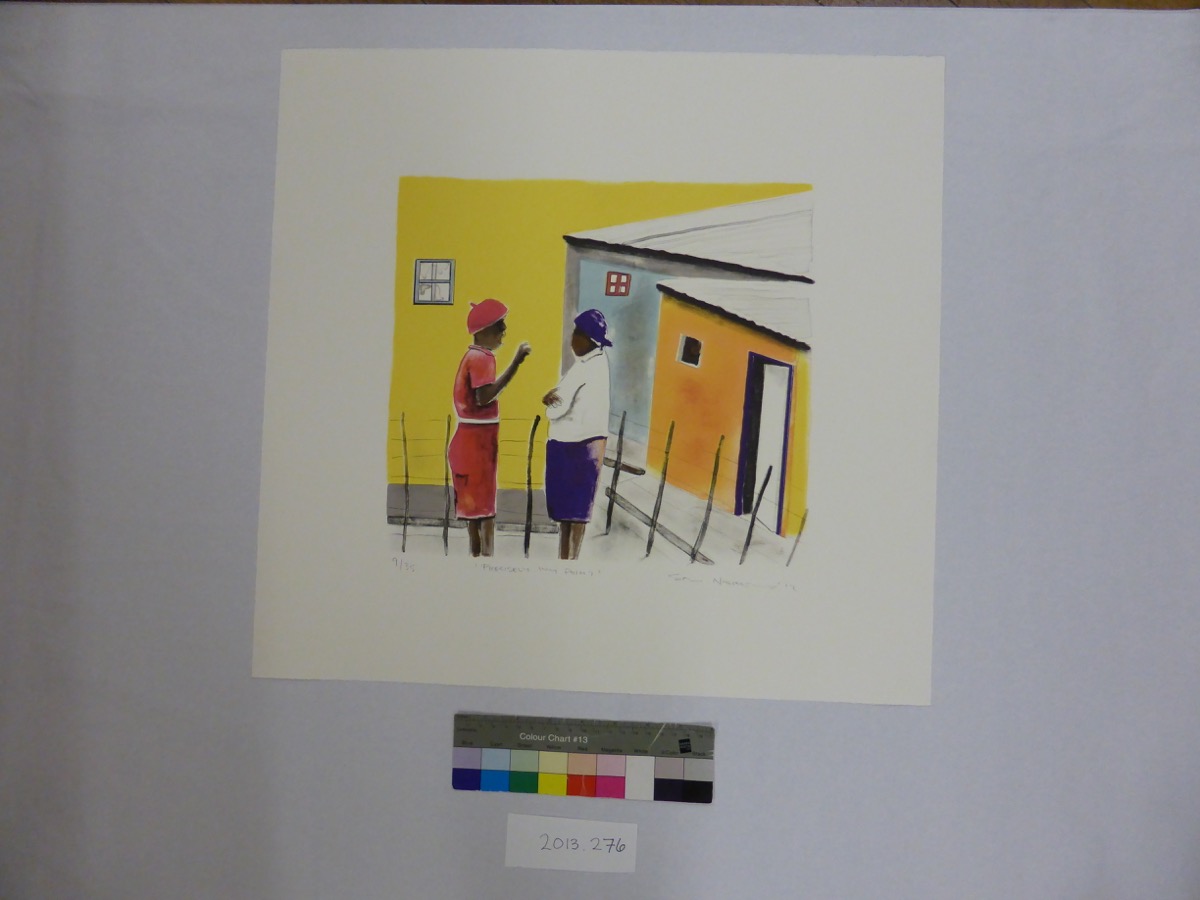 Presented by The Art Fund and the Esmée Fairbairn Foundation. An acquisition project to build a collection of modern and contemporary work on paper from Australia, Canada and South Africa was undertaken over 2011-13 with the support of a grant under The Art Fund's RENEW programme. The collection was developed with the expert advice and generous assistance of Annie Coombes and Norman Vorano in relation to South African and Inuit artists respectively. Khadija Carroll, Anita Herle and Diana Wood Conroy also contributed to the selection process. Obtained as part of a larger group of prints (2013.266- 283) from The Artists' Press (The Artists' Press, Waterboard Farm, White River, Mpumalanga Province, South Africa).