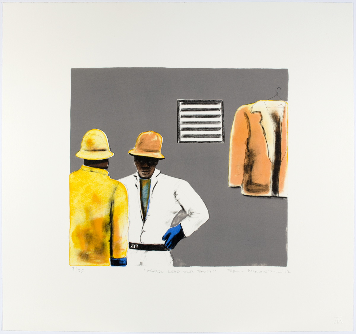 Sam Nhlengethwa (b. 1955) is one of South Africa's most important living artists. He studied at Rorke's Drift and sustains the legacy of that foundationally-important art centre, that exemplified the vital work of printmaking in empowering and representing black South African experience and history. He went on to win a major prize, Standard Bank's Young Artist of the Year, in 1994, the year of South Africa's first democratic elections. Since then he has exhibited extensively, nationally and internationally. His work has embraced a range of techniques, styles and subjects. It is enormously valuable for a UK collection, in that the range of his prints effectively communicate key dimensions of South African life, ranging from mine-work and township life through defining events of the history of the struggle to the inspiration of jazz.