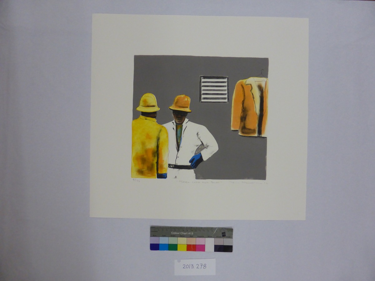 Presented by The Art Fund and the Esmée Fairbairn Foundation. An acquisition project to build a collection of modern and contemporary work on paper from Australia, Canada and South Africa was undertaken over 2011-13 with the support of a grant under The Art Fund's RENEW programme. The collection was developed with the expert advice and generous assistance of Annie Coombes and Norman Vorano in relation to South African and Inuit artists respectively. Khadija Carroll, Anita Herle and Diana Wood Conroy also contributed to the selection process. Obtained as part of a larger group of prints (2013.266- 283) from The Artists' Press (The Artists' Press, Waterboard Farm, White River, Mpumalanga Province, South Africa).