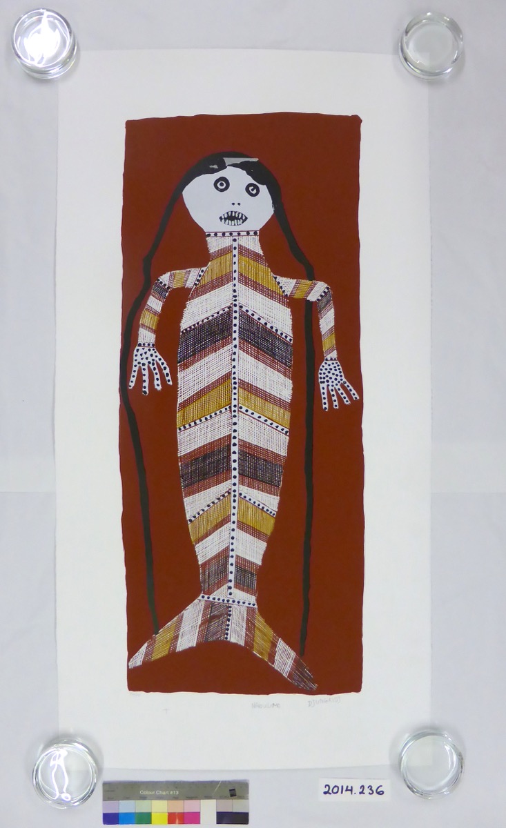 The print is described as 'Yawk Yawk are female water spirits that closely resemble the European idea of mermaids. Half spirit, half fish, they entice unwary fishermen beneath the water of the lagoons that are their domain throughout Arnhem Land. They may have long hair like reeds of trailing water weed and can take on the features of fish or body of a snake. When fully grown Yawk Yawk spirits can leave their water hole to forage for food by changing their fishtails into legs to walk on dry land or assume the shape of a dragonfly to fly. Yawk Yawk figures are also closely associated with Ngaloyd, the Rainbow Serpent and can be associated with sorcery'. Taken from http://www.aboriginalartprints.com.au/works_enlargement.php?work_id=521