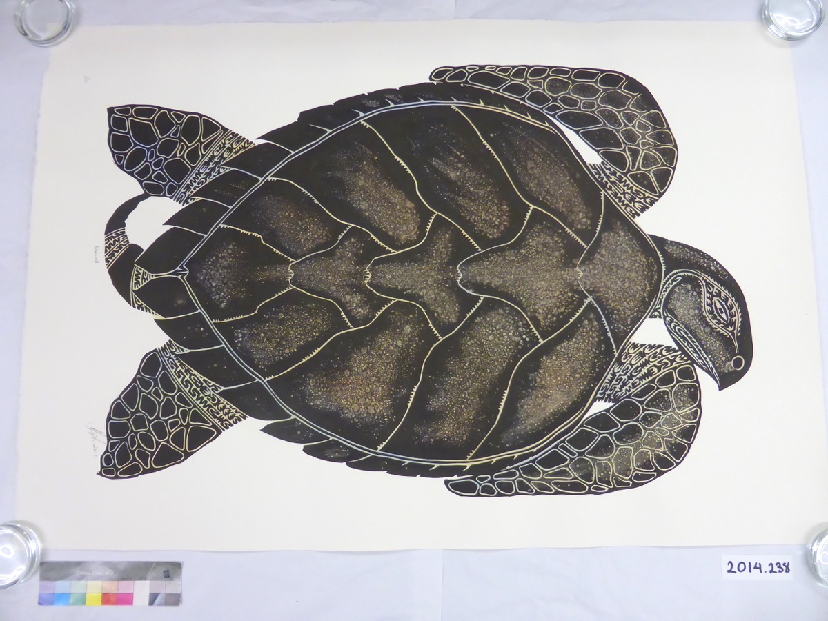 Linocut described by Tipoti as 'Turtle shell flake or Koeral in the language of the Maluyigal people of Zenadh Kes (Torres Strait) refers to the carpace of the Wa'ar (Greenback Turtle) and Wanuwa (Hawksbill Turtle). The flakes were used by Torres Strait Islanders for countless generations to create Masks for traditional cultural rituals.